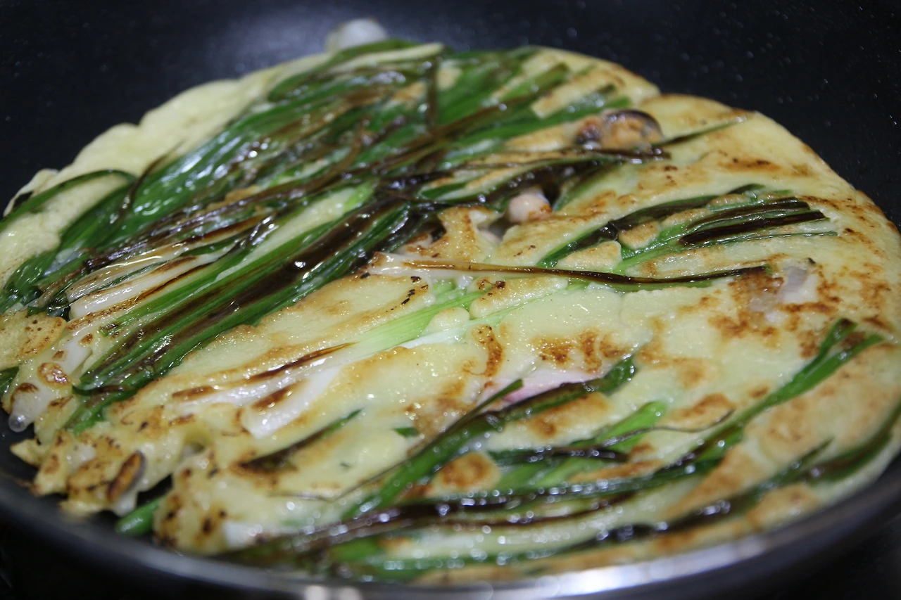 가장자리가 보글보글 기름이 올라오며 바삭하니 익으면 파전을 뒤집어 준다.