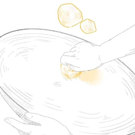엄마는 큰 볼에 감자 간 것, 전분, 굵은소금을 넣고 손으로 휘휘 섞어주고, 숱을 담은 화로 위에 가마솥 뚜껑을 조심히 올려놓습니다. 남겨둔 감자 하나를 조각내 손잡이를 만들어 잡고, 들기름을 찍어 가마솥에 스윽 문지르면 금세 코끝에 전해오는 들기름 냄새가 온 집안을 뒤덮고, 킁킁거리다 못해 부엌을 향하도록 만들지요.
