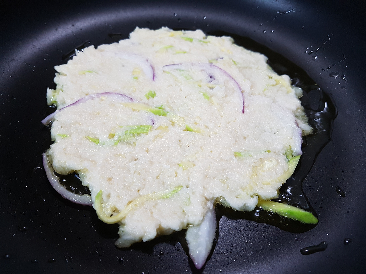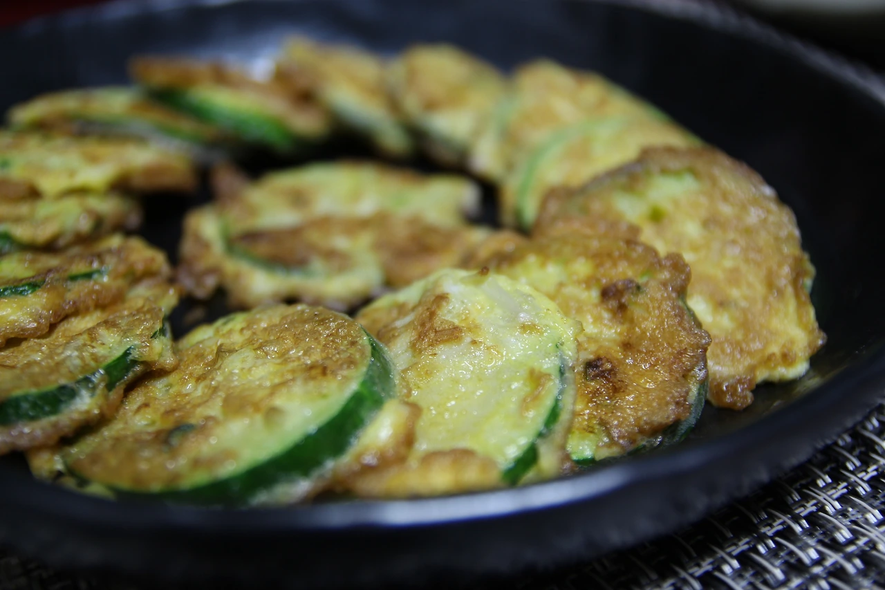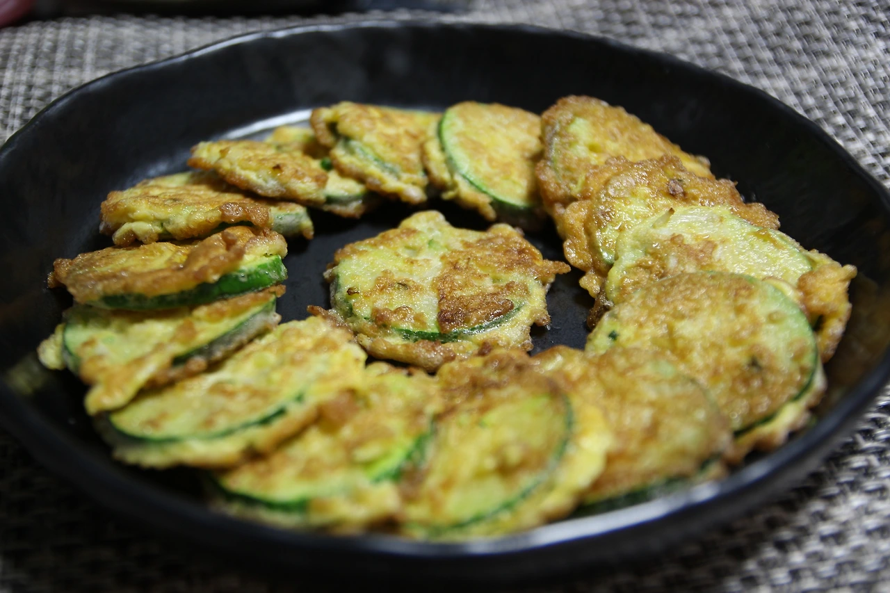 애호박에 묻은 밀가루를 털어내고 계란물을 입히고 오일팬에 앞뒤로 굽는다.