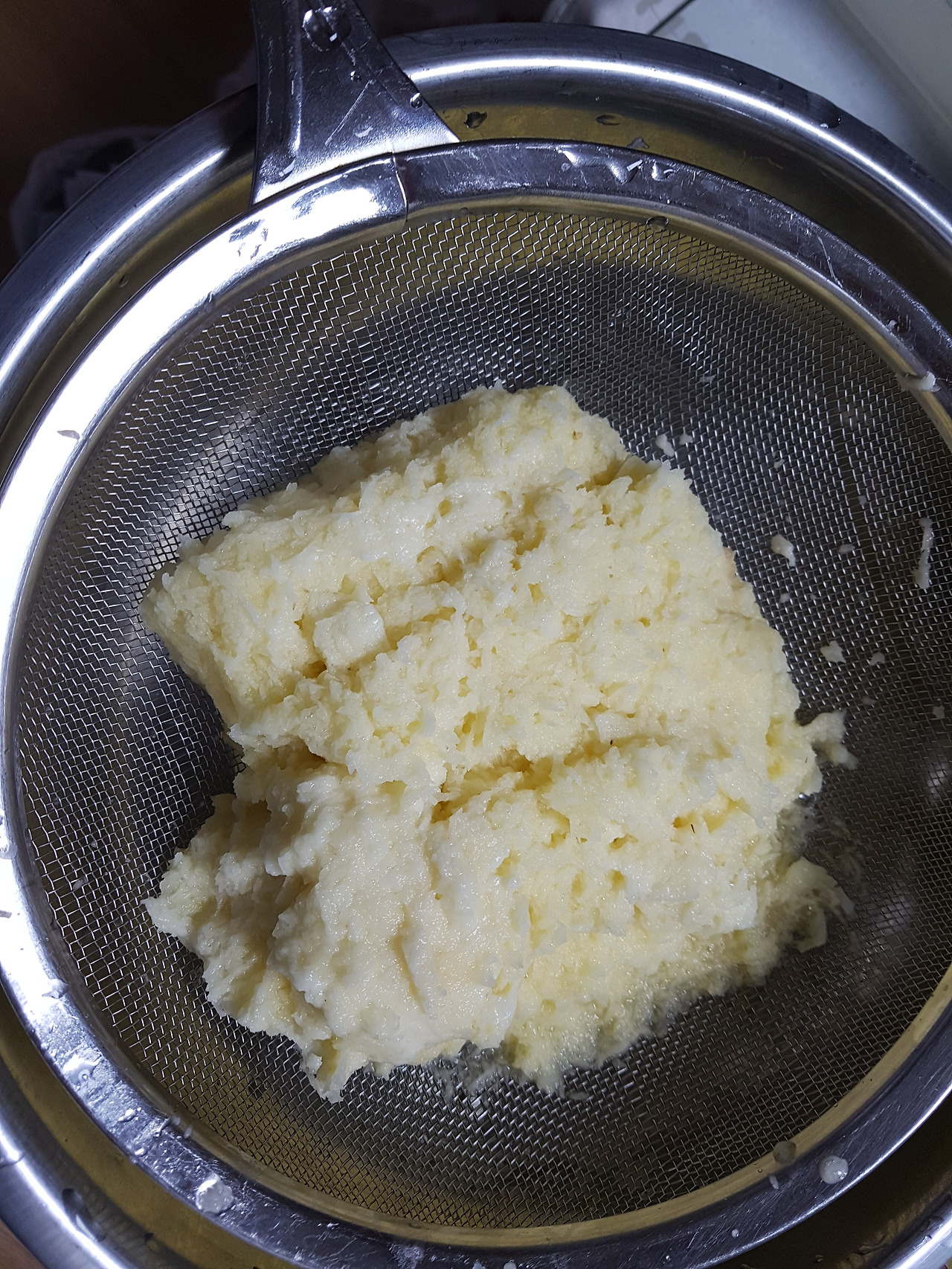 감자 물은 잠시 방치한 후, 물은 따라내고 바닥에 가라앉은 녹말은 감자 간 것에 섞는다.