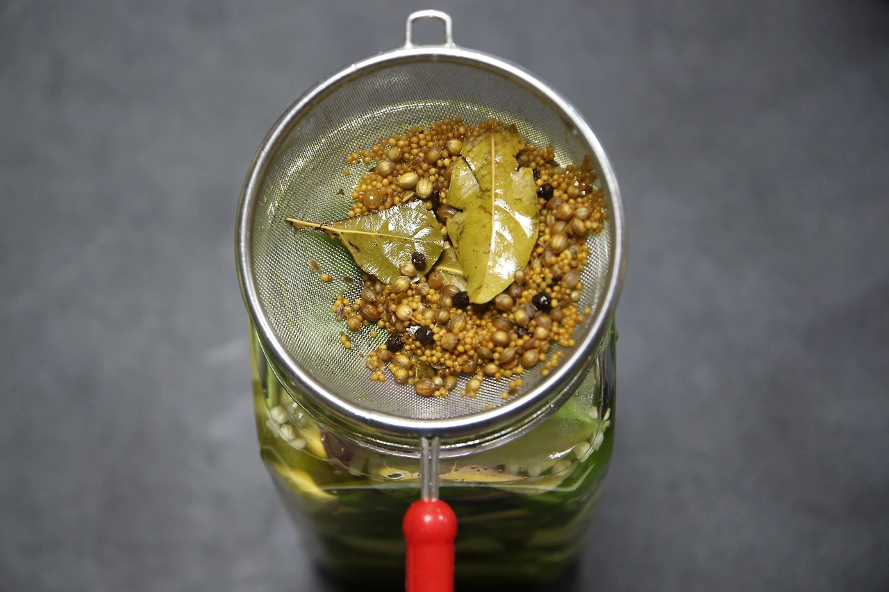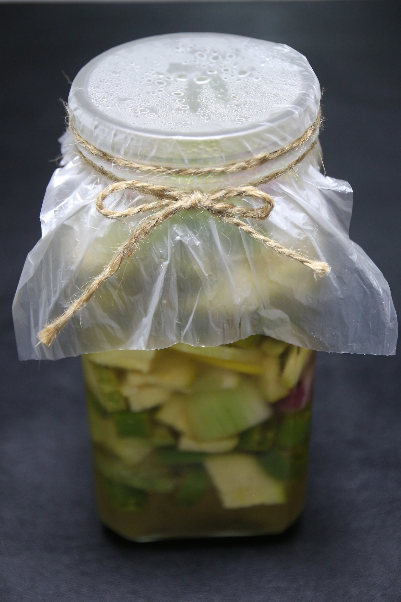유리병에 뜨거운 절임물을 부어준다. 채소에서 물이 나오면서 부피가 줄므로 절임물은 가득 붓지 않아도 된다.