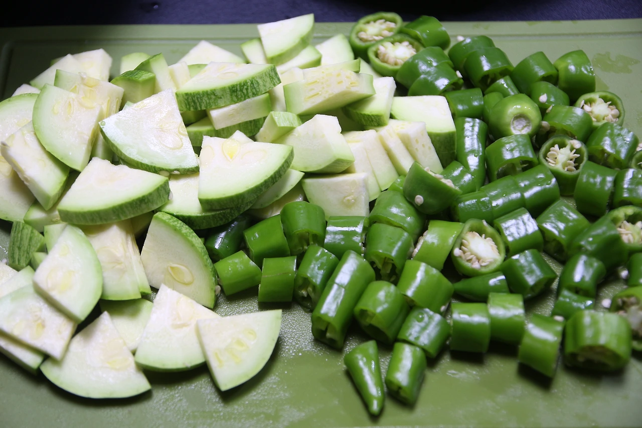 애호박은 반달 모양으로 썰고, 고추는 1cm 두께로, 양파는 깍둑 모양으로 썬다.