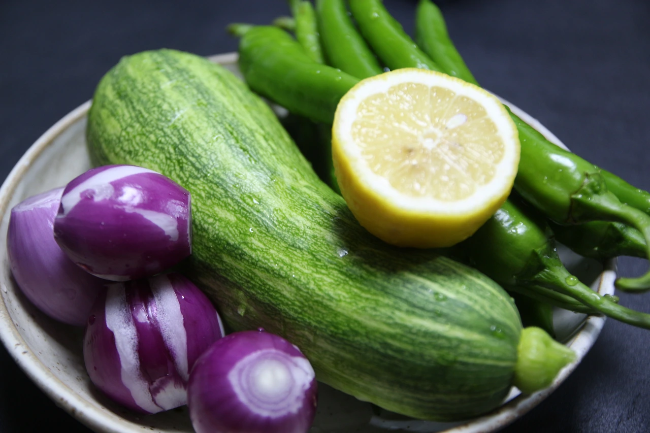 재료: 애호박 2개, 레몬 1/2개. 오이 고추 5개, 청양고추 2개, 적양파 2개(중간 크기)