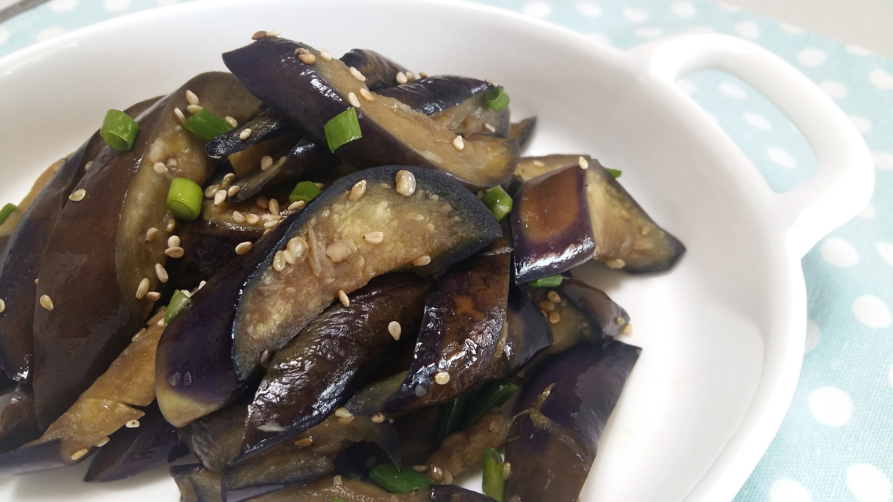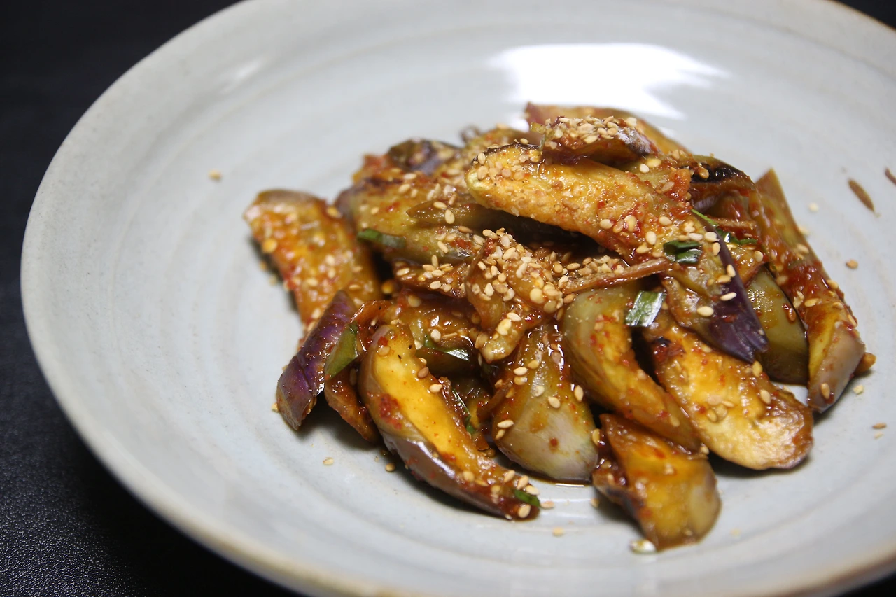 완성된 가지 볶음을 접시에 담고 깨를 뿌려주면 완성이다.