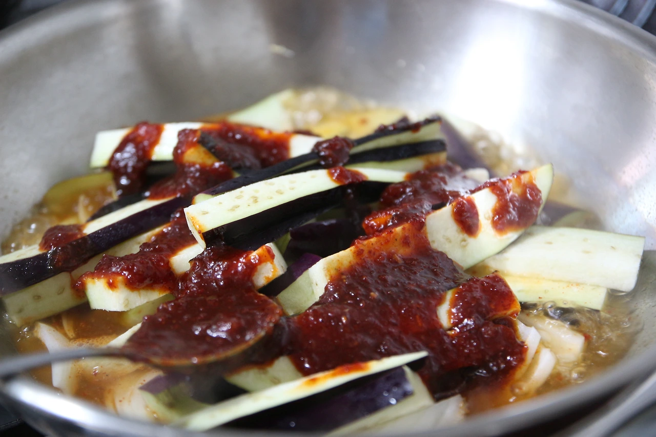 가지 위에 양념장을 올리고 물을 한 컵 부어 조린다. 양념장은 약간 남기고 입맛에 따라 가감한다. (양념은 매콤, 달콤한 맛이다. 단맛은 기호에 따라 조정한다.)