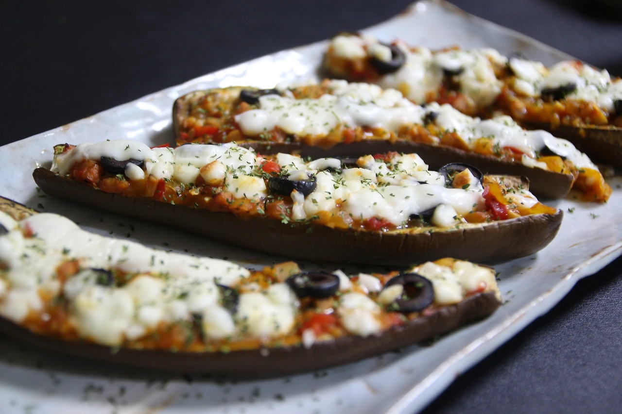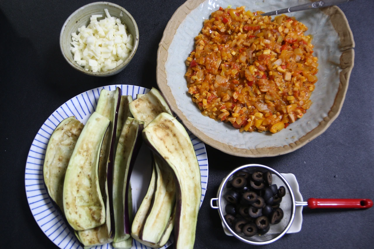 위의 재료에 올리브를 하나씩 올리고 치즈를 뿌린 후 오븐에 10분 정도 구워준다.(오븐이 없다면 프라이 팬에 기름을 살짝 두르고, 은근한 불에 뚜껑을 덮고 가지가 익을 정도로 구워주면 된다.