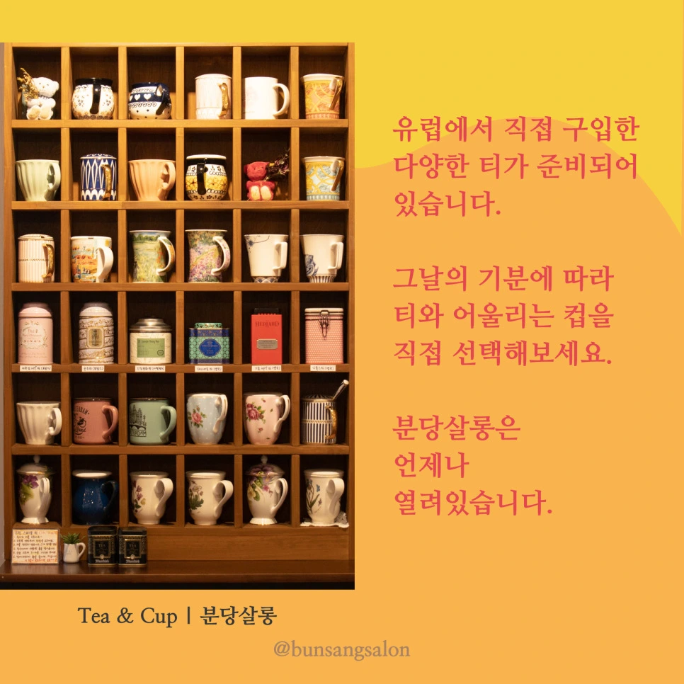 분당 살롱은 공간 대여와 함께 차를 마실 수 있도록 준비해 놓았다. 세계 여러 나라에서 온 멋진 잔을 내 마음대로 골라 마시면 된다. 커피가 2,000원 매우 저렴하다. 원하면 핸드드립도 가능하다.