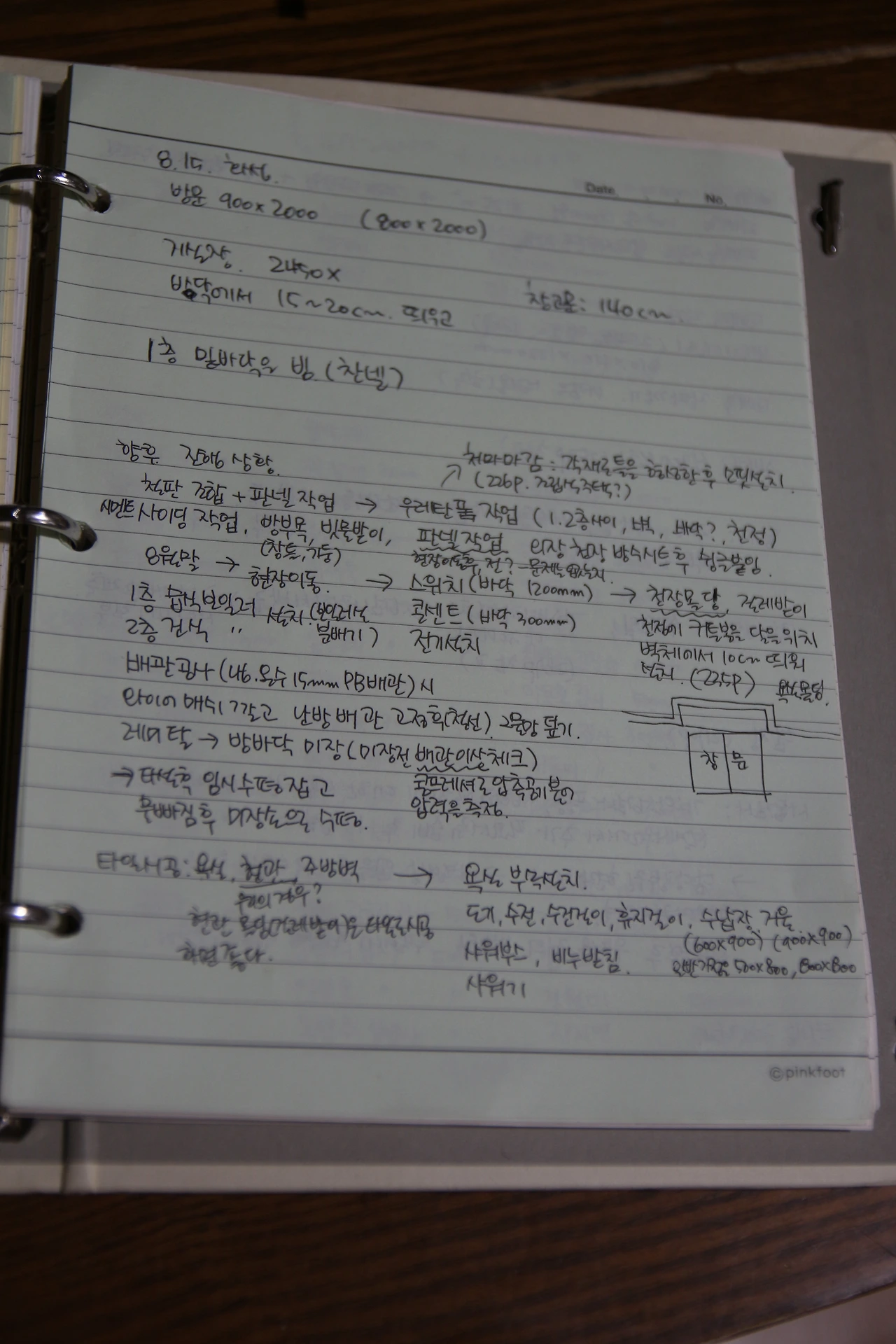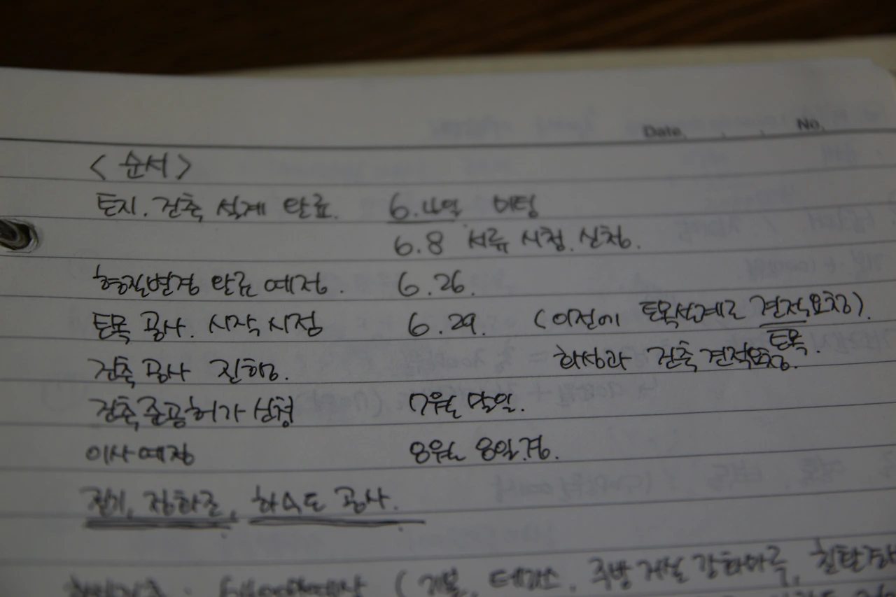 공사 계획 단계부터 진행순서까지 혹시 모를 착오가 없도록 꼼꼼히 노트에 기록했다. 5월 말 토목, 건축 설계사와 미팅 후 본격적인 진행은 6월부터 시작하였고 8월이면 공사가 끝날 것으로 계획을 세웠지만 설계에서부터 약속을 어기는 일이 빈번하다 보니 토목공사가 2달 늦게 진행되었다. 앞에서도 언급했지만 건축설계사는 계약금을 포기하고 업체를 변경하여 진행되었다. 문제는 재건축 빌라를 매도하고 월세를 살고 있었는데 월세를 연장해야 한다는 거다. 다행히 빌라 매도 계약 시 월세 연장과 퇴거 시의 조건을 요청했고, 매수자가 수락했기에 큰 문제는 되지 않았다. 월세를 더 산다고 하니 공실이 되지 않아 매수자도 좋아했다. 다만 생각지 못한 월세비용이 추가되었다.