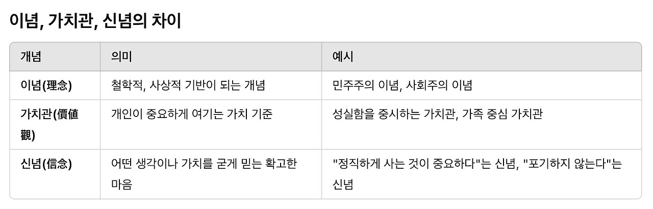 • 이념 : 사람이 가지고 있는 기본적인 생각이나 신념, 가치관을 의미, 어떤 사상이나 철학의 근본이 되는 개념을 가리킬 때 쓰이며, 특정한 사회적, 정치적, 윤리적 방향성.
