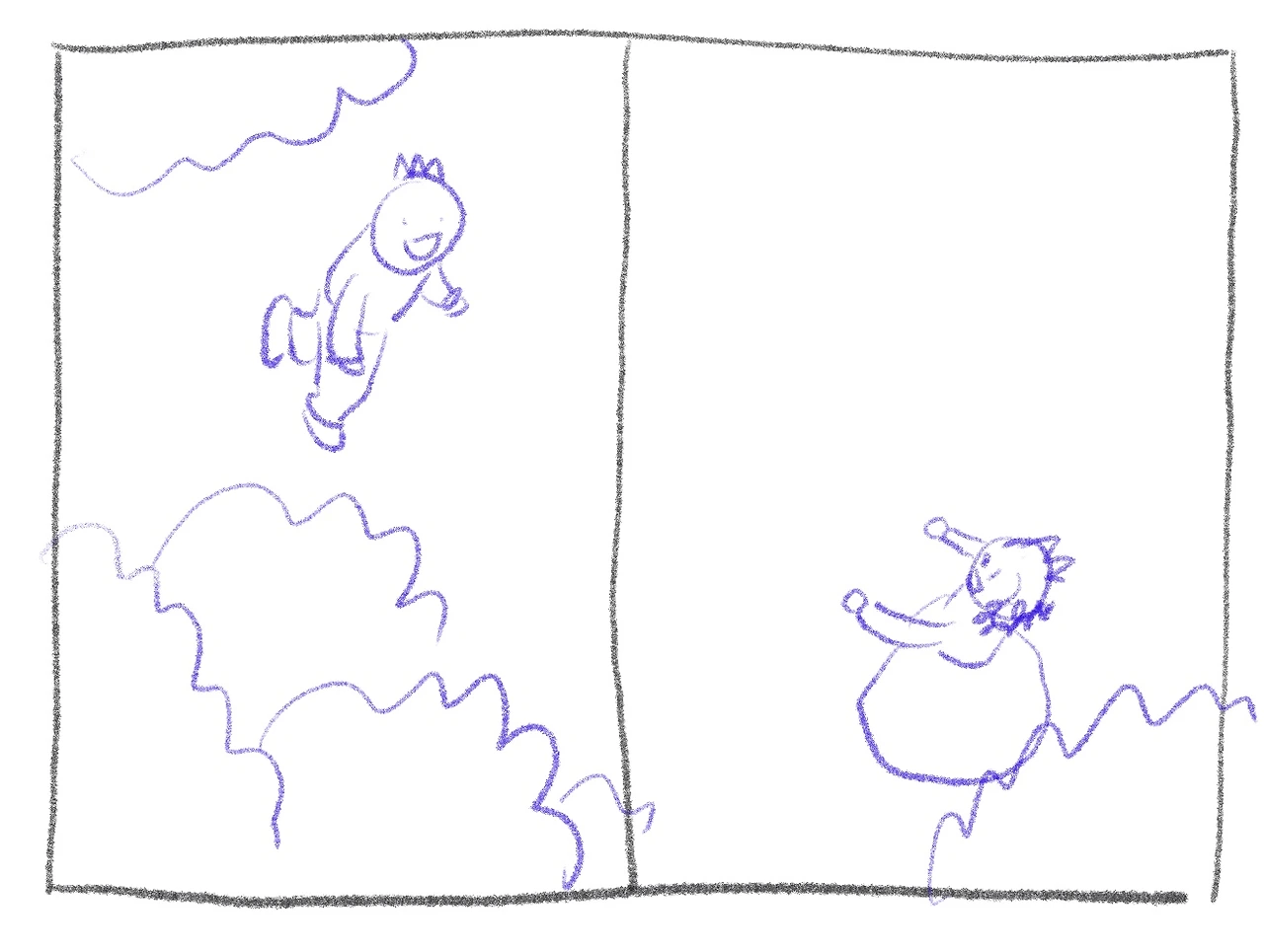 왼쪽 그림에서 오른쪽 페이지 상단이 비어 있어요.그래요. 거기가 글 자리예요.이렇게 이야기하면 싫어할 작가분들도 계시겠지만 그림책에서 그림이 완성되려면 글자가 얹어져야 완성된 그림이 된다고 생각하시는 게 좋을 것 같아요.그림책은 제본까지 된 상태가 완성이니까요.