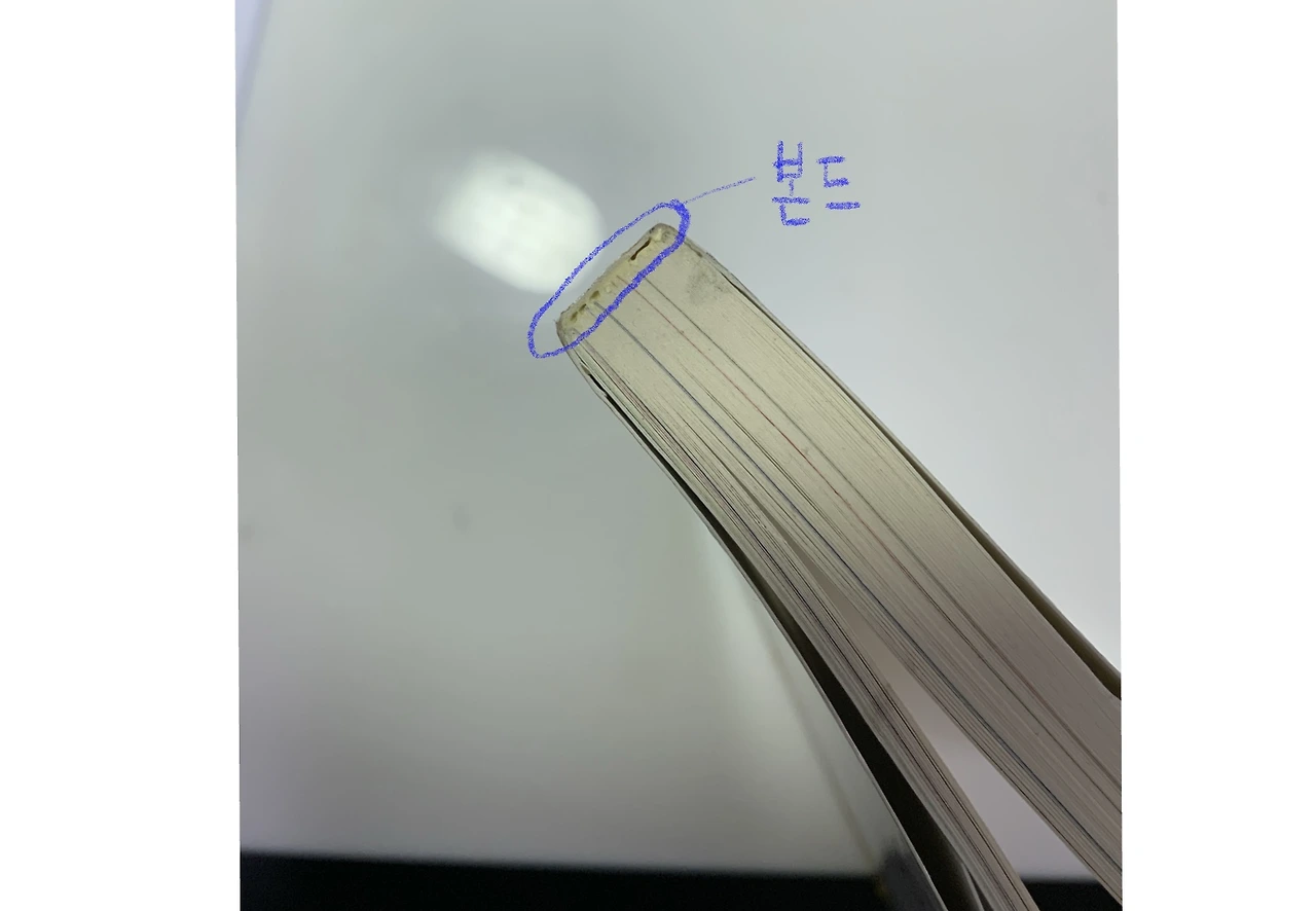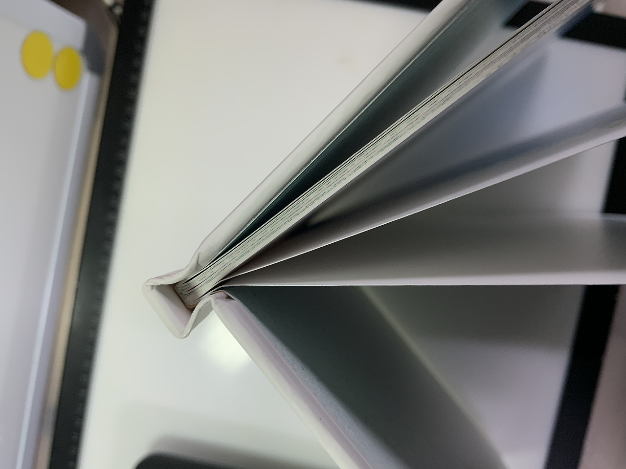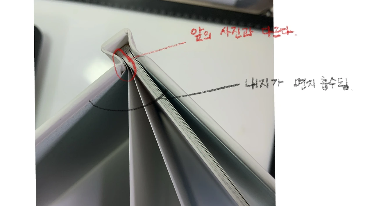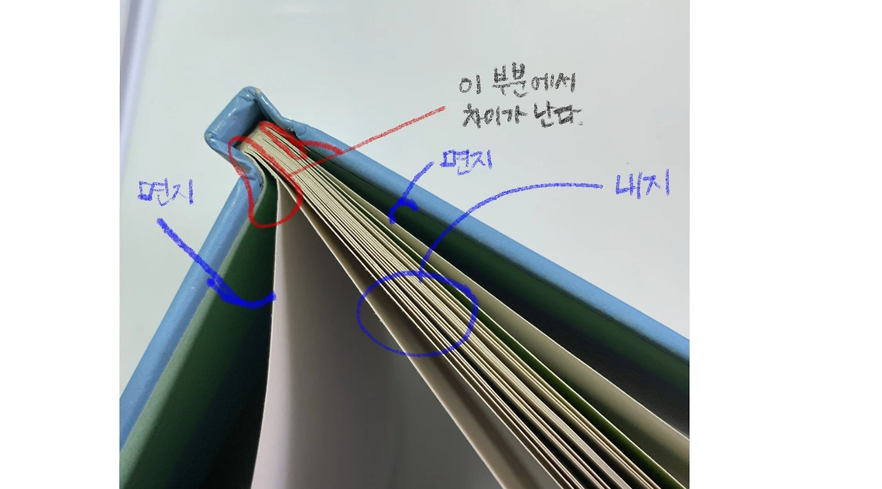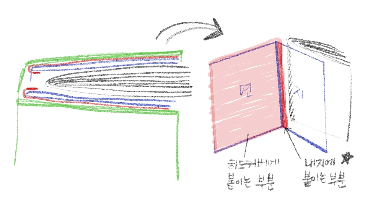 커버는 면지와 딱 맞게 풀칠해 주시고 내지 부분은 접지 쪽으로 1cm 정도만 풀칠해서 면지와 내지가 붙게 해 줍니다. (면지와 내지 쪽을 다 붙이는 것 아님) 앞, 뒤 다 마찬가지입니다. 그렇게 만든 책은 아래 사진처럼 내지의 첫 장이 조금 붙게 돼요. (빨간색으로 표시된 부분)