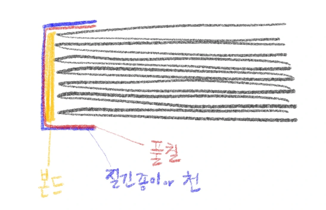 여기에 한 번 더 단단히 고정하기 위해 책 등 부분만 한 번 더 본드질 하는 것도 추천해요. (책 등 부분을 한 번 더 처리하는 방법은 오리진 하게 책을 만들 때 사용되는 방법이기도 해요.)
