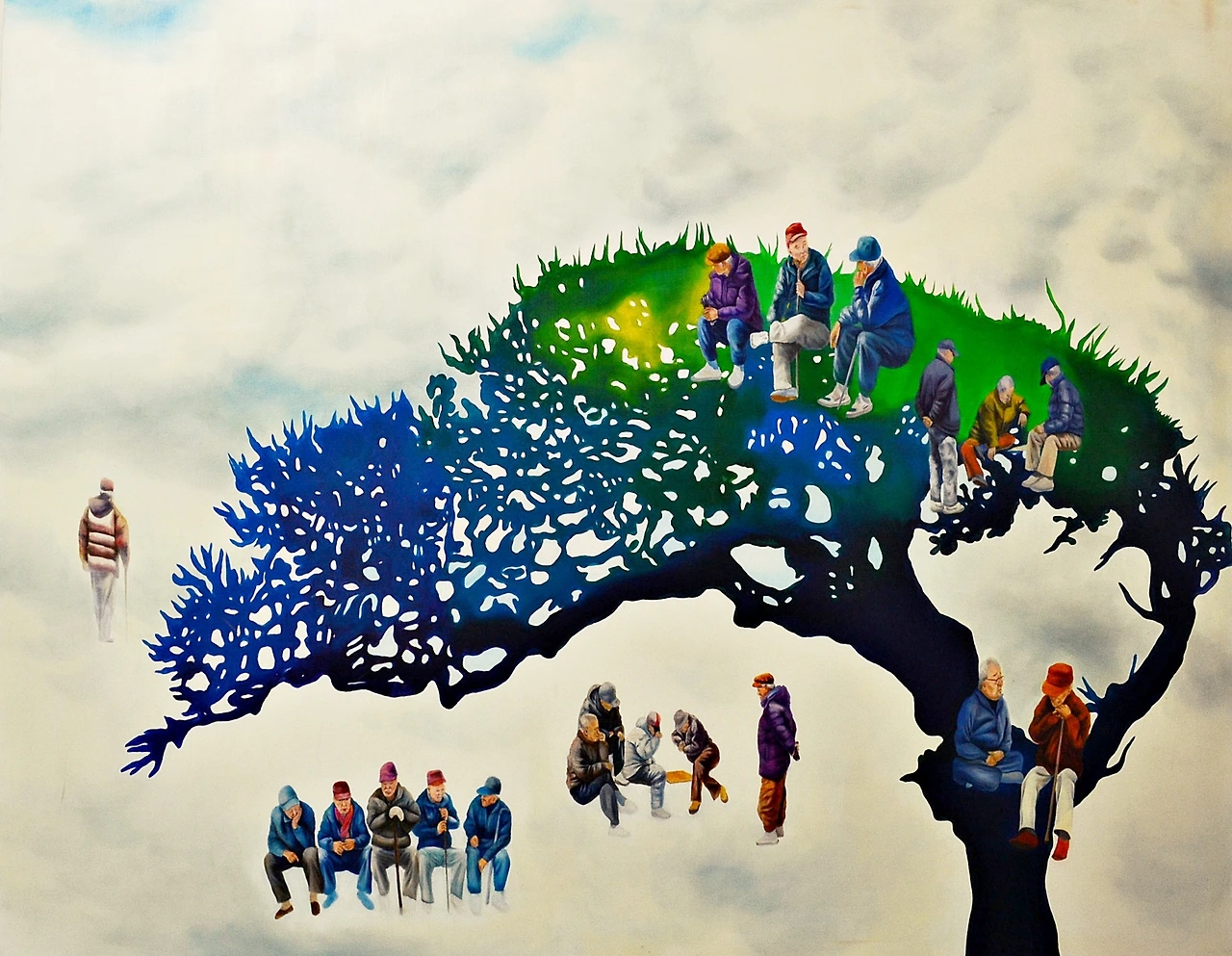 위의 그림은 제가 개인적으로 남다르게 애정을 갖고 있는 그림입니다. 큰 나무를 표현하고 싶어서 커다란 캔버스에 작업을 했습니다. 어르신들이 서로 대화를 하기도 하고 장기를 두시기도 합니다. 나무는 여름 나무로 그린 후 어르신들은 겨울옷을 입고 있는 것으로 그려내고 싶었습니다. 여름 나무를 표현한 것은 이분들도 푸르른 시절 있었다는 것을 말하고 싶었습니다.