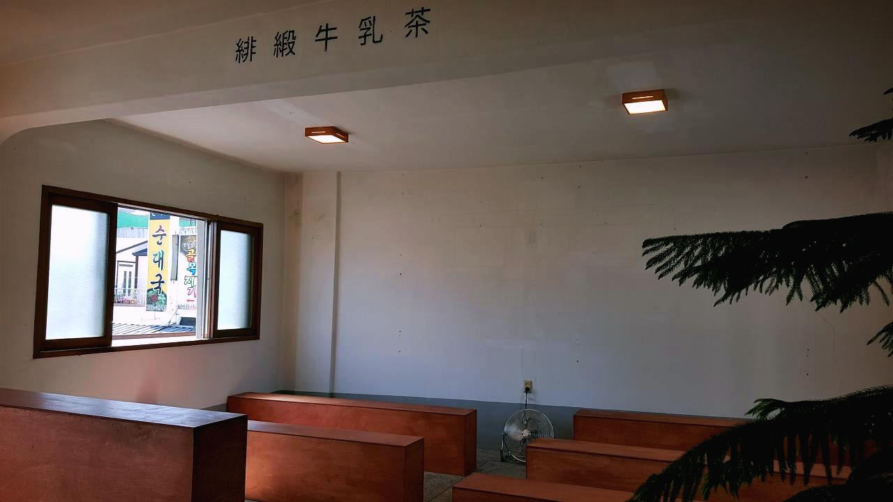 이곳은 서울 염리동에 있던 카페인데 올 4월 속초로 이전을 했단다. 칠성조선소와 비단우유차는 아주 근거리에 위치해 있었다. 물회집에서는 차로 3분 거리가 된다. '비단우유차'는 문을 열었겠지? 하며, 2층 계단을 따로 올라갔다. 테이블 없이 목재로 만든 기다란 의자가 쿨하게 놓여있다. 손님이 와도 '안녕하세요. 어서오세요' 인사는 들리지 않는다. 아 카페의 컨셉이다. 비치된 메뉴판을 읽어보고 마음에 드는 음료를 종이에 적는다. '땡'하고 종을 치면 사장이 나와 주문을 받는다. 재밌다.