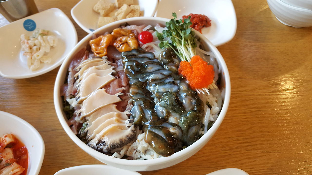 속초에 가면 언제나 만석이니 중앙이란 이름으로 닭강정을 파는 속초중앙시장이 1순위였던 내게, 이곳 엑스포로는 처음 와보는 속초였다. 느낌이 사뭇달라서 두리번거리며 자리에 앉으니 곧 물회를 내어준다. 꼬들하고 쫀득한 해산물이 입 속에 들어오니 시원하고 흐뭇했다. 싫어하는 멍게를 모르고 먹었지만 그냥 잘 씹어 삼켰다. 반찬으로 인절미가 나온 이유가 신기했는데, 물회 양념으로 얼큰해진 혀를 달래주기 위함인 듯 했다.