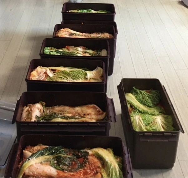 배추가 대문 옆에 다 쌓아지고 나면 일일이 배추를 마당으로 들여놔야 했다. 그러면 온 집안 식구들이 양동이에 담기도 하고 둘씩 짝을 지어 커다란 다라이에 배추를 함께 담아 나르기도 했고, 동생들은 혼자 1포기씩 나르고 나면 마당에는 배추 산이 생겼다. 그러면 엄마는 광 속에 꼭꼭 자고 있던 커다란 다라이들을 몽땅 꺼내 배추를 절이셨다.