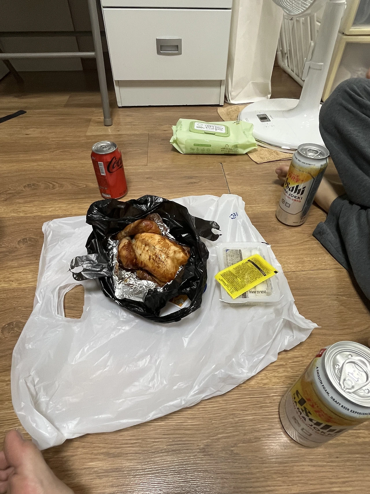 그 후 길거리에서 파는 찹쌀구이통닭과 맥주를 사서