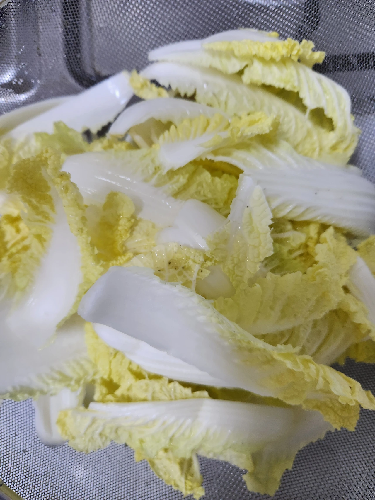 겉잎은 벌레들이 먹고 남은 배추 속을 씻고 데쳐둔다. 보기엔 엄청 조금이지만 배추 2포기 결과물이다 ^^