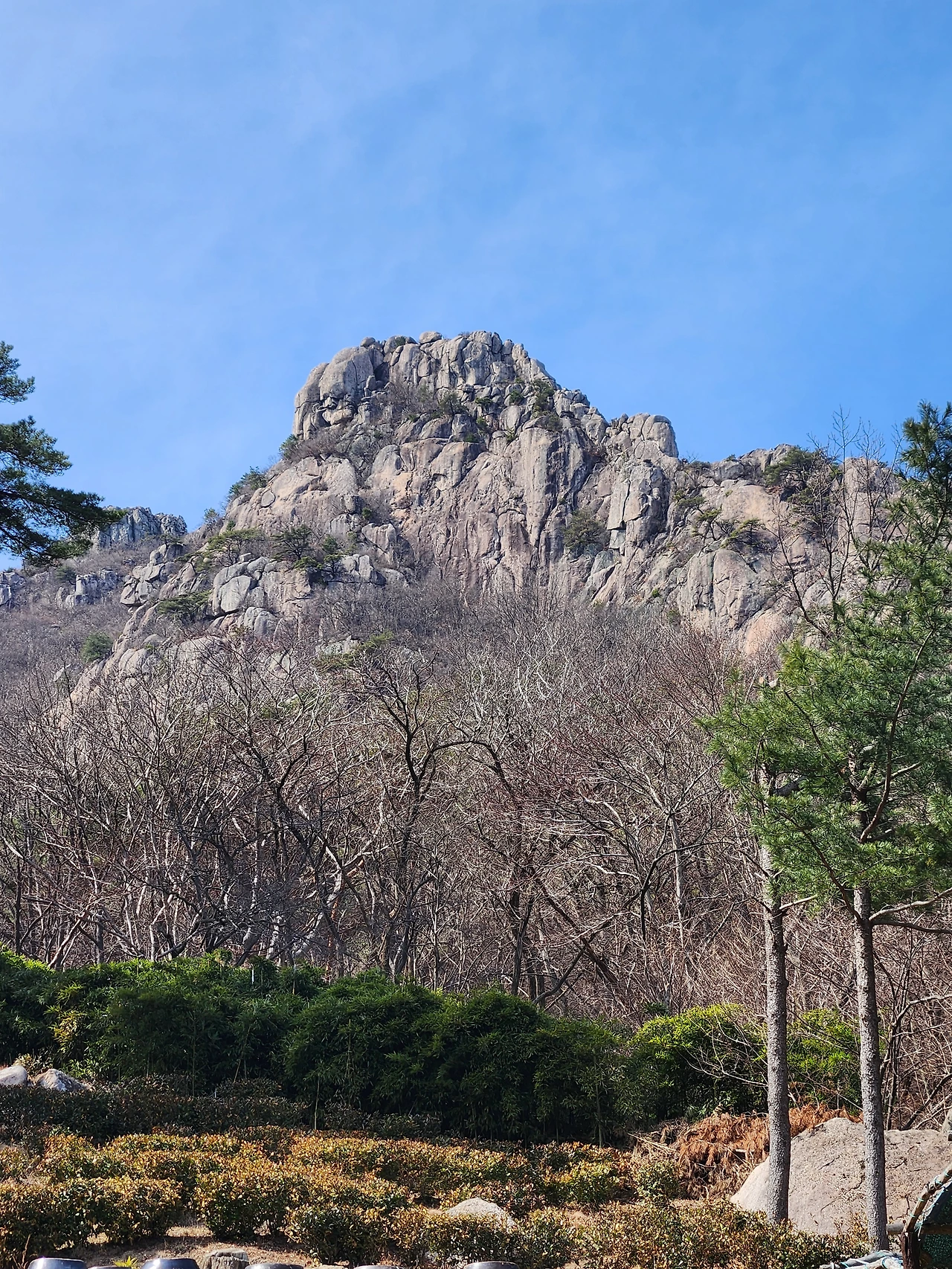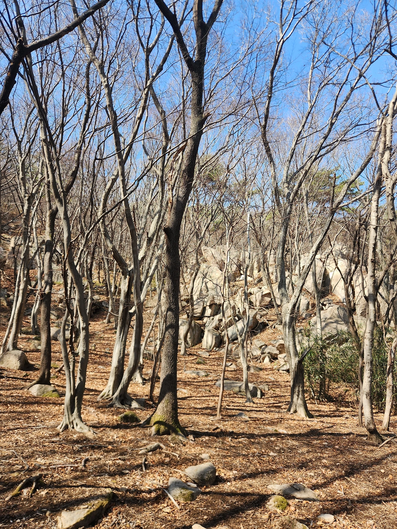 잎 하나 없는 나무들과 금정산의 바위길을 따라서 가다 보니 점점 우리가 가려던 길과는 멀어졌다. 우리는 숲 속 둘레길을 걸을 예정이었는데, 금정산 산허리를 따라가고 있었다.