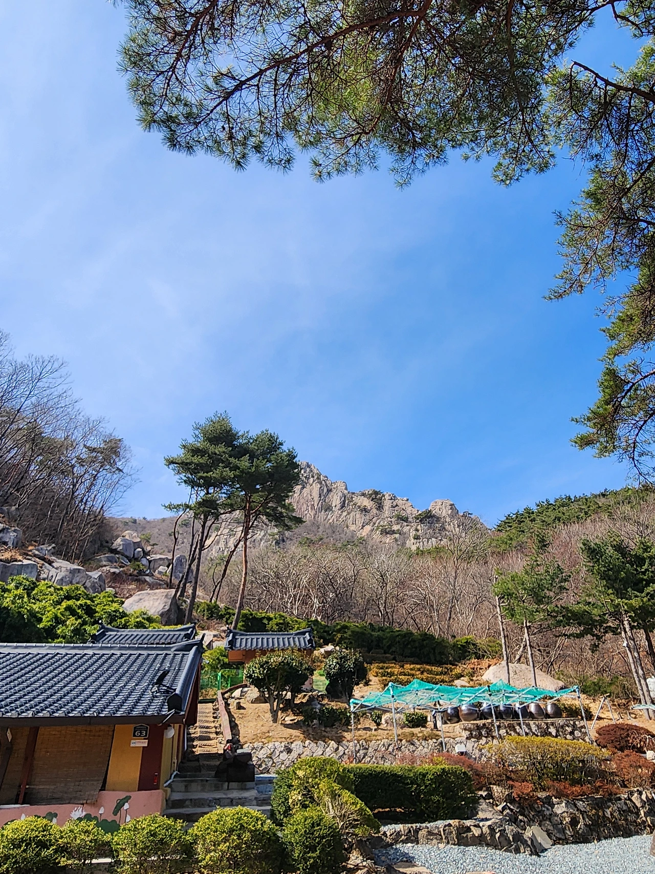 절 바로 뒤에 큰 바위들이 있고, 그 먼 뒤쪽에는 무명바위(?)라는 ‘이름이 있는 바위’들이 장관으로 우뚝 서 있었다. 우리가 산 아래 멀리서 금정산을 바라보면 보이는 바위 무리들이 여럿 있는데, 그 가운데 하나 같아 보였다. 그러니까 처음 보는 바위들은 아니었다는 거다.