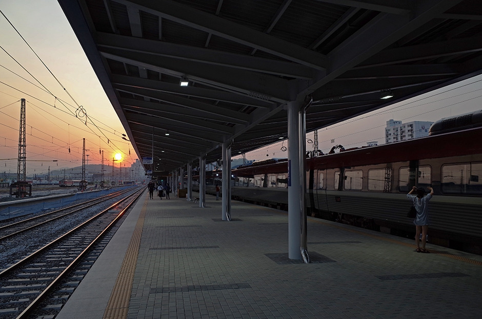 기차에서 내리면 역의 출구를 향해 모두가 한 방향으로 걷게 된다.