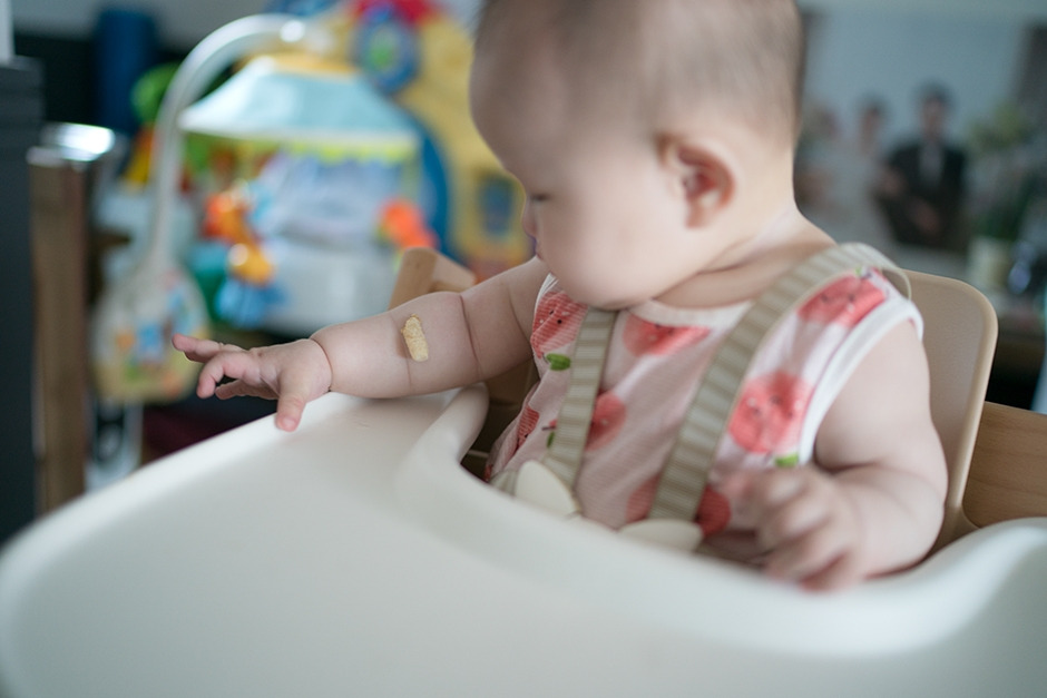 아가가 먹던 과자를 놓쳤는데 팔에 딱 붙어버렸다.