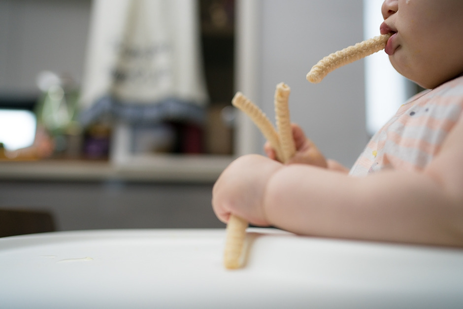 아가는 봉지에 손을 넣고 과자를 집는다.
