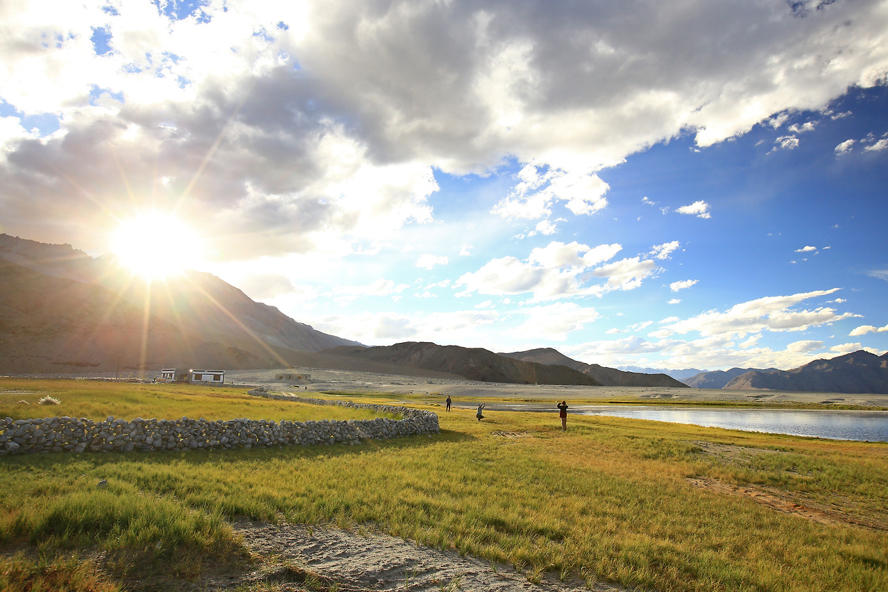 판공초 앞 초원에서 소들이 평화롭게 풀을 뜯고 있는 모습이 보이는 목가적인 느낌의 그림 같은 풍경의 마을이었습니다.