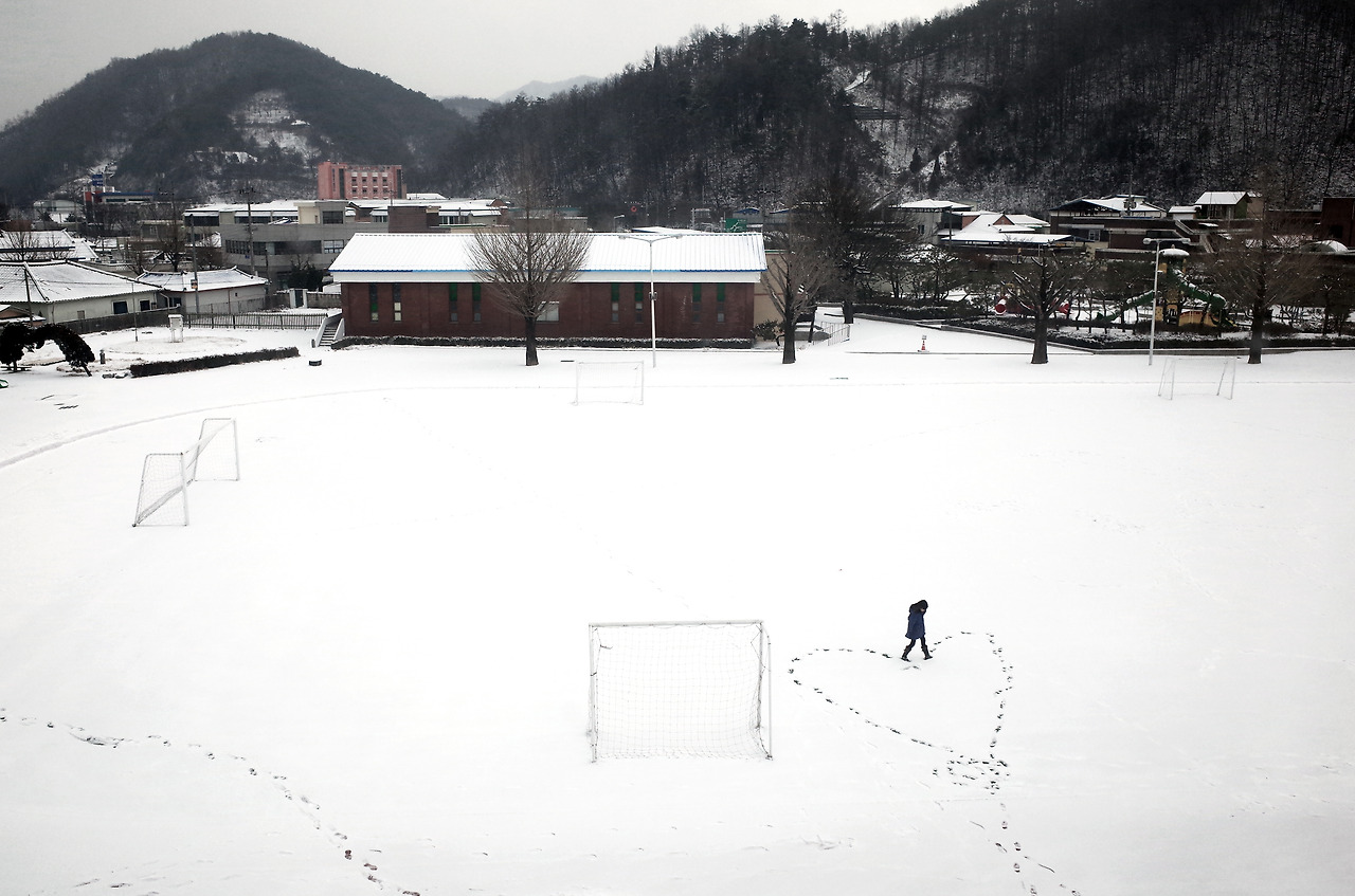 눈으로 덮인 고요한 운동장에 한 학생이 조심스럽게 첫 발자국을 남긴다.