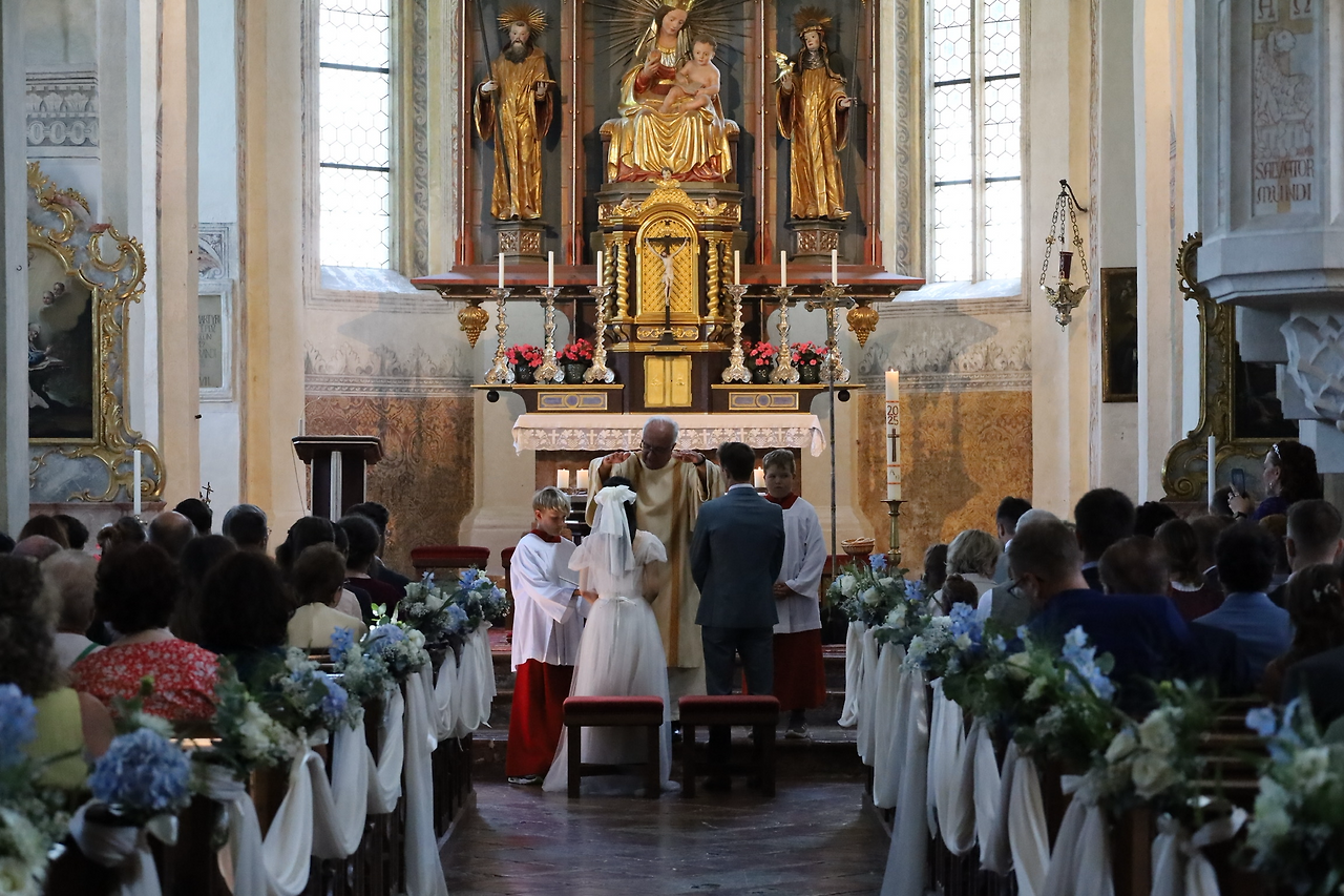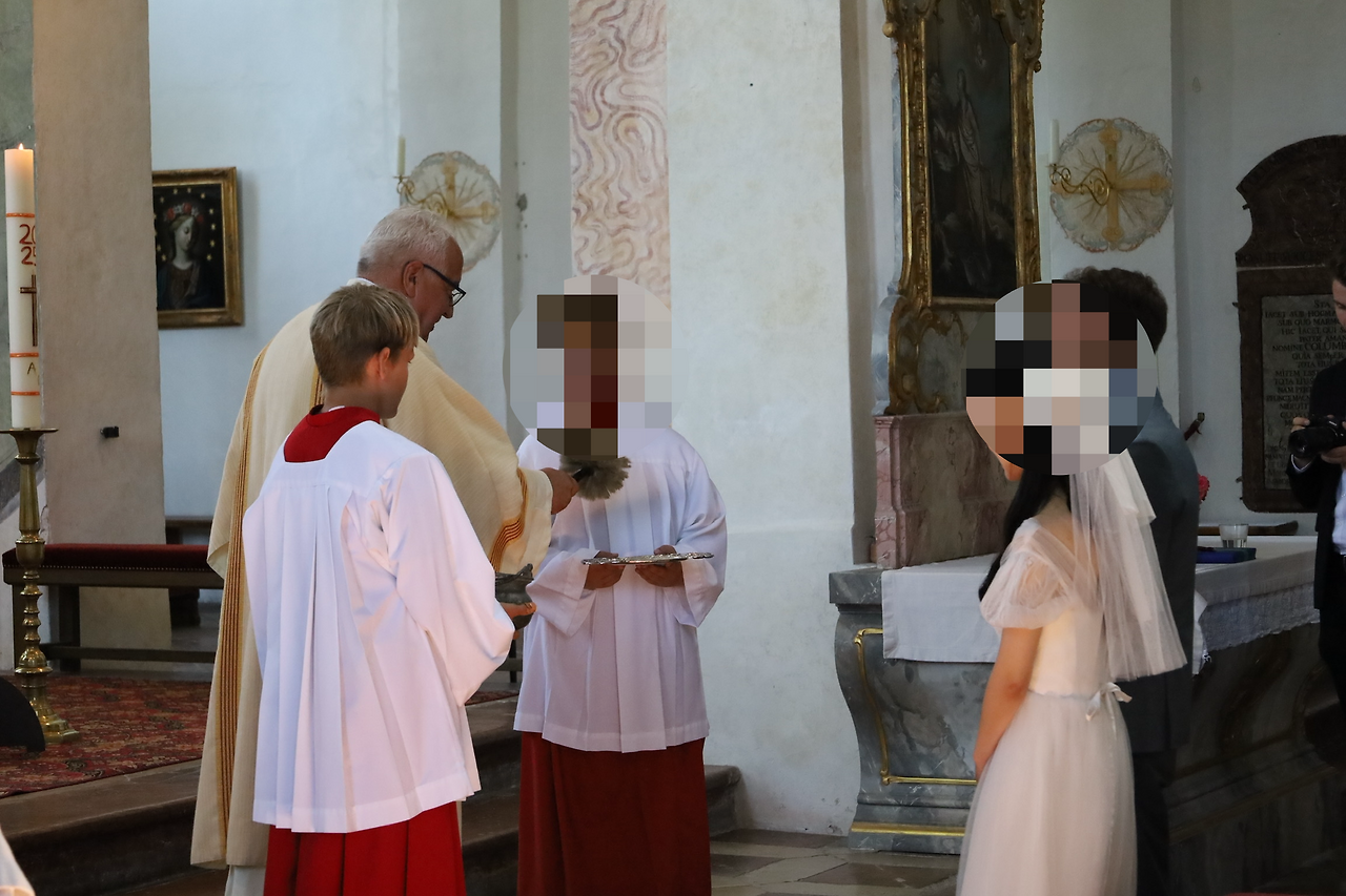 교회에서 하는 결혼식이다 보니, 이번에는 슈탄데스베암테가 아닌 성직자가 결혼식을 주관했어요. 이 날 결혼식을 주관한 사제는 가톨릭 교회 신부님이셨습니다. 굵은 동굴 목소리가 인상적이었죠. 어린 복사들의 도움을 받으며 신랑 신부에게 축복을 내리고, 혼인서약서를 읽는 과정 등을 주관하셨어요.