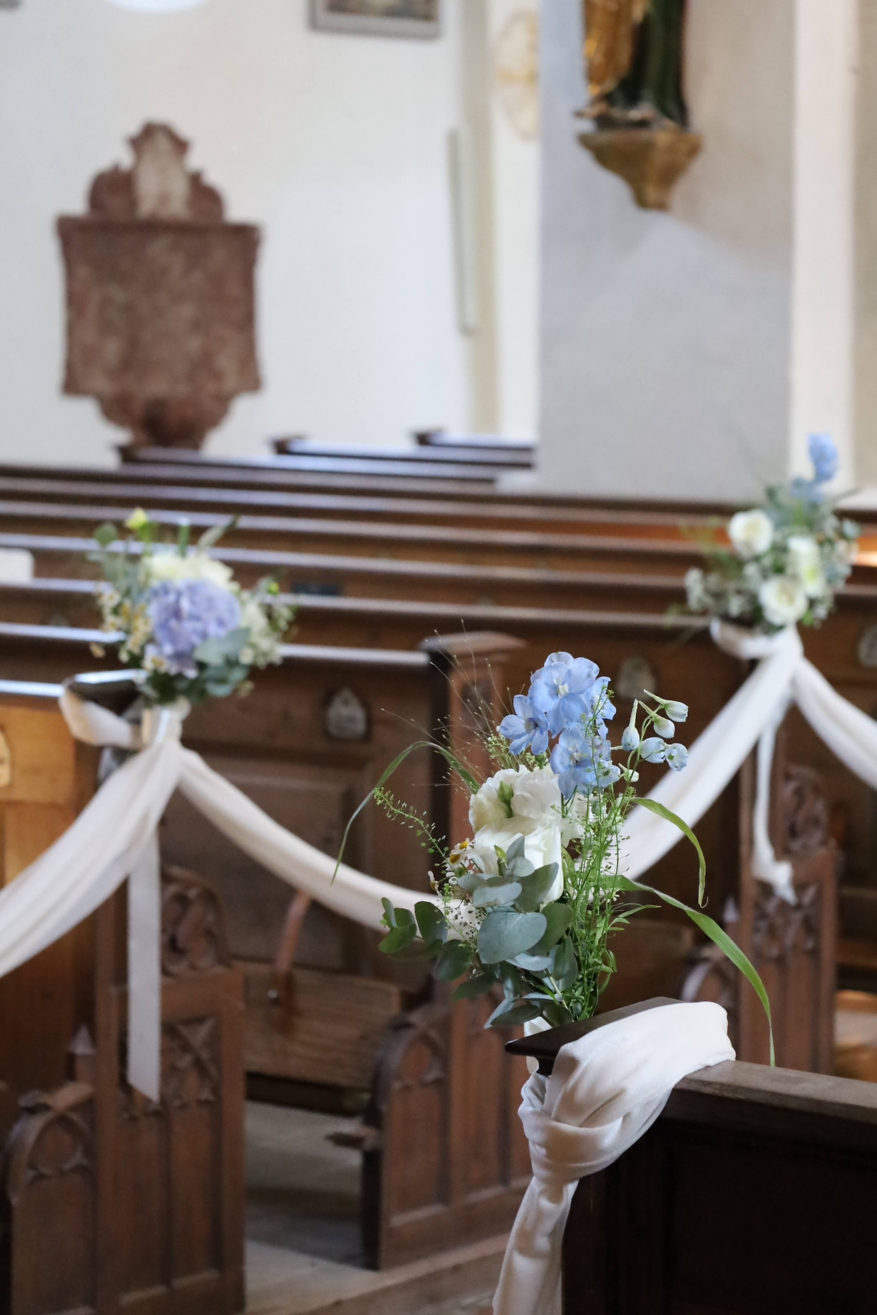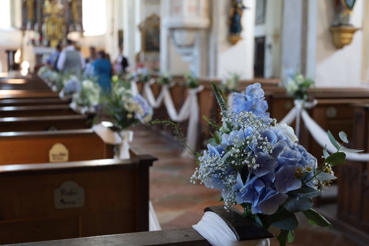 신부의 사촌언니가 직접 하나하나 고르고 묶은 꽃다발 장식도 인상적이었어요. 흰 천과 꽃다발만 둘렀을 뿐인데, 교회 공간 전체의 분위기가 달라졌죠. 오전에 슈탄데스베암테와의 '혼인 서약'을 마치고 두 시간 정도 시간이 비었는데, 그때 열심히 단장을 마쳤습니다. 파란 꽃잎들이 화창한 여름날에 탄생한 신혼부부에게 행운을 빌어주는 것만 같더라고요.