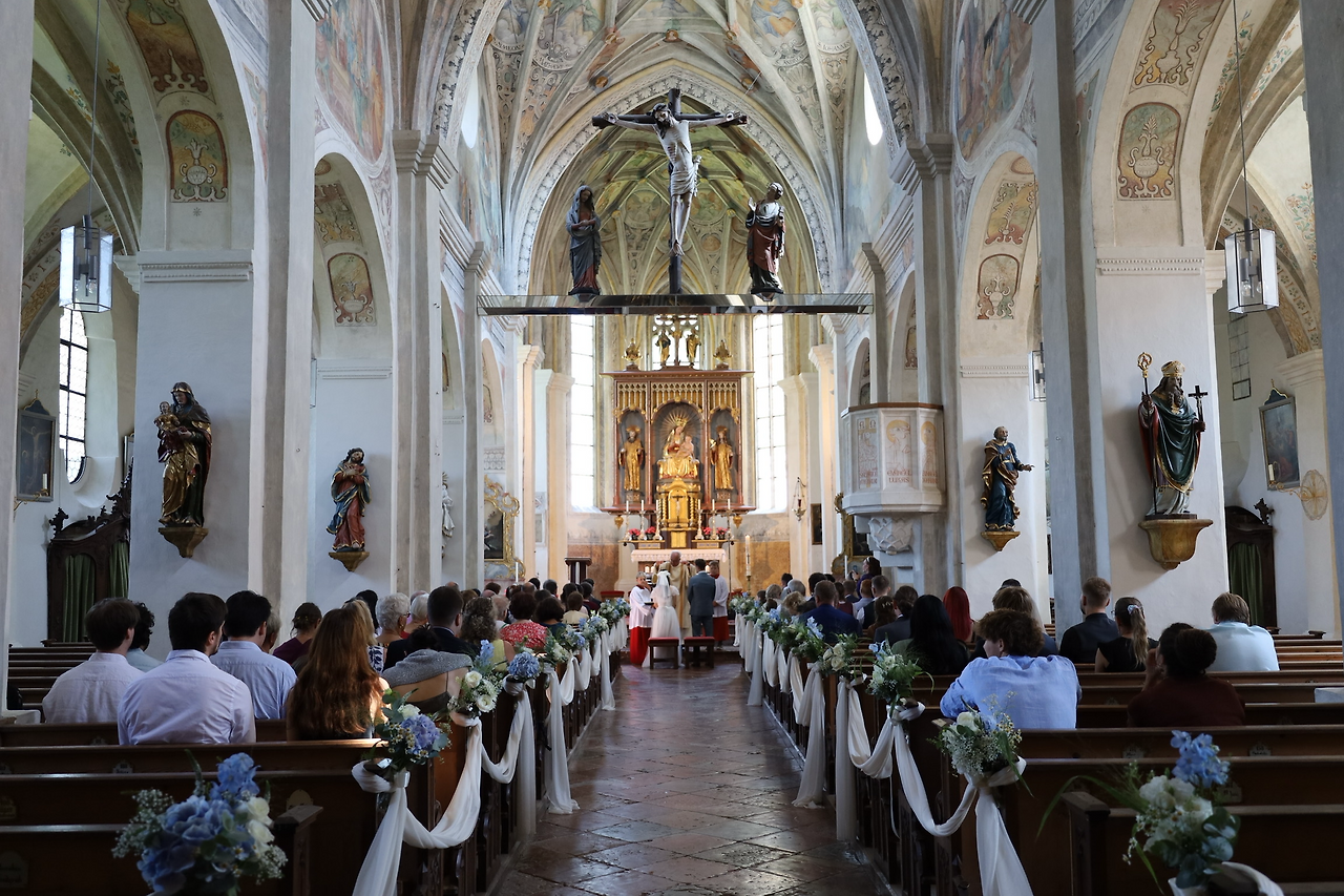 하지만 여기서 끝나면 '수도원 결혼식'이 아니죠. 멋진 수도원 교회(Klosterkirche)에서 잊지 못할 추억을 남길 수 있는 기회도 남아있으니까요. 이 교회는 수도원이 설립되던 994년에 함께 지어졌습니다. 이후 중세와 근현대의 긴 역사를 거치며 확장되기도 하고, 일부는 재건되기도 했죠. 그래서일까요? 로마네스크 양식의 두꺼운 기둥과 라운드 아치, 바로크와 로코코 양식의 천장 프레스코화 등 다양한 시대의 양식이 공존하며 멋진 분위기를 자아냅니다.