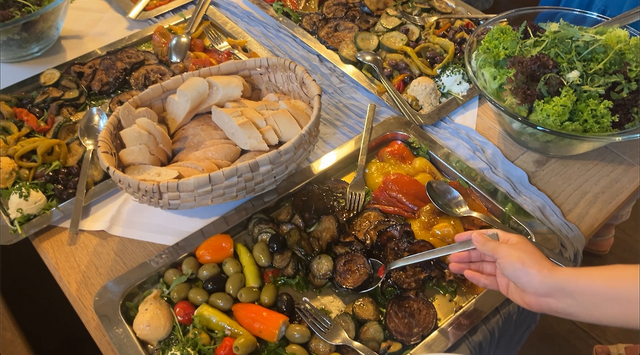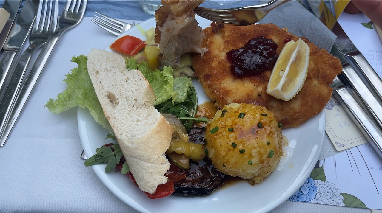 파티는 준비된 순서를 하나씩 거치며 금세 저녁 식사로 이어졌습니다. 오후부터 계속 먹고 마시는 중인데 저녁 식사라니요! 하지만 계속 웃고 떠들어서 그런지, 또 먹게 되더라고요. 레스토랑에서는 뷔페식 만찬을 제공했고, 슈니첼과 슈바인학센을 비롯해 전형적인 독일식 요리들이 접시를 채웠습니다.