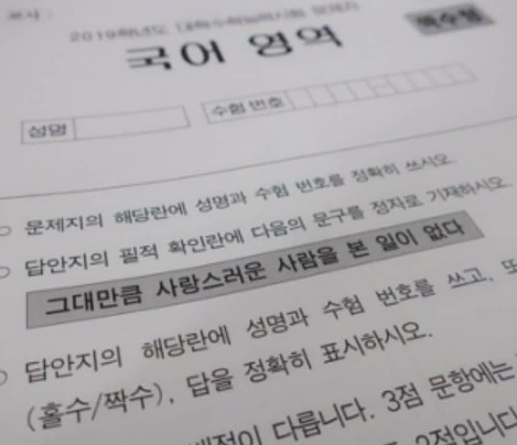 수능 모의고사 답안지에는 필적확인란이란 게 있다. 부정행위가 벌어졌을 때 본인여부를 확인할 목적으로 자필 문장을 적게 하는데, 적어야 할 문장은 시험지 첫 페이지에 적혀 있다.