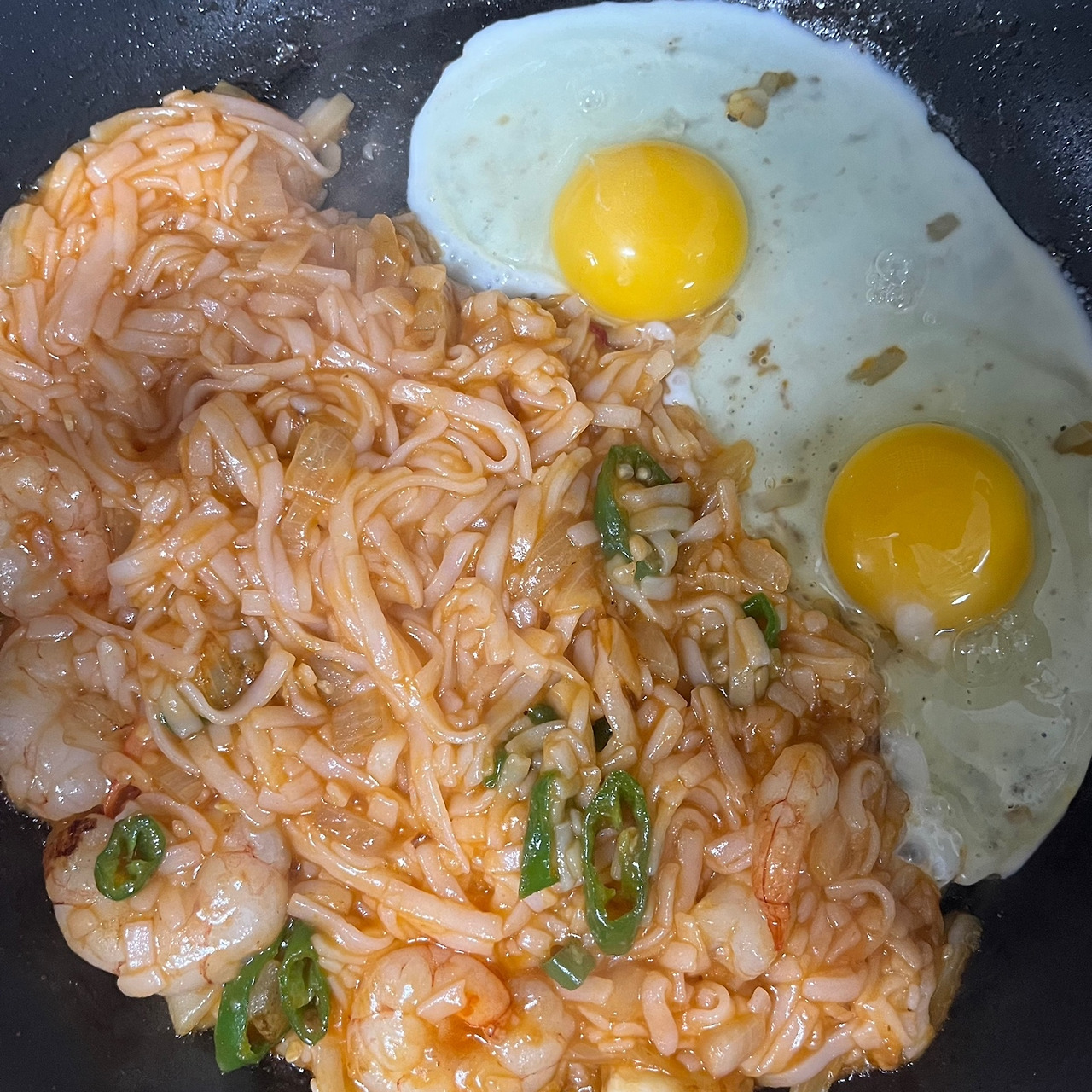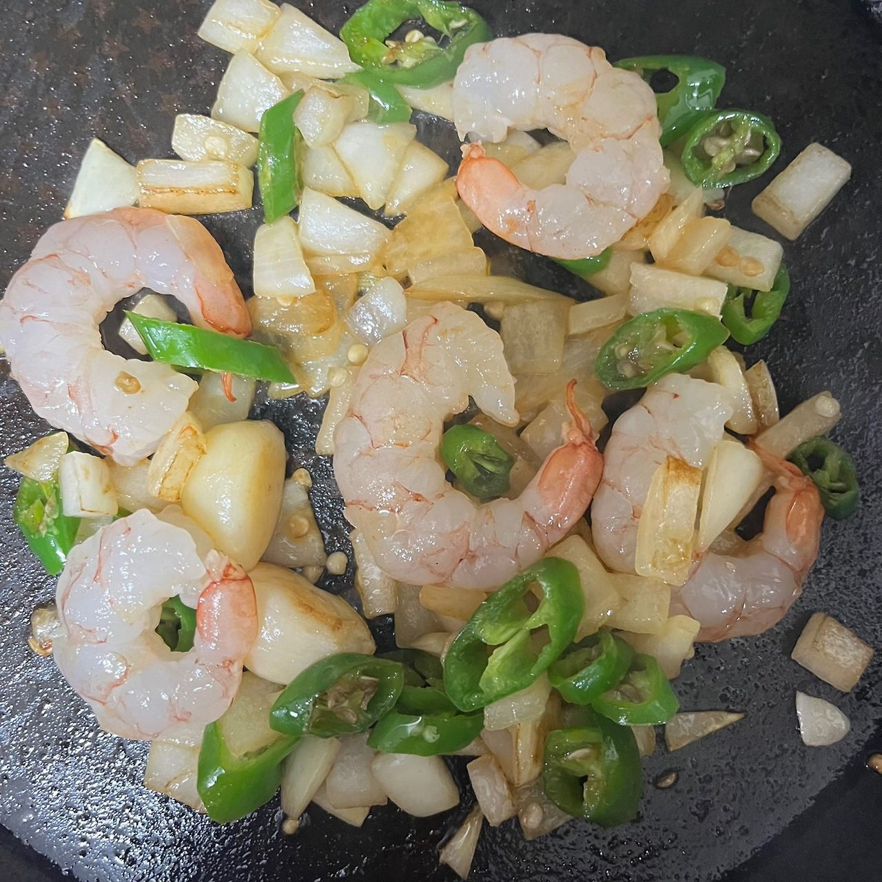 적당히 볶은 뒤에 새우를 넣고 더 볶아주었다.