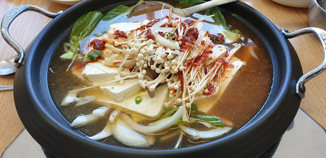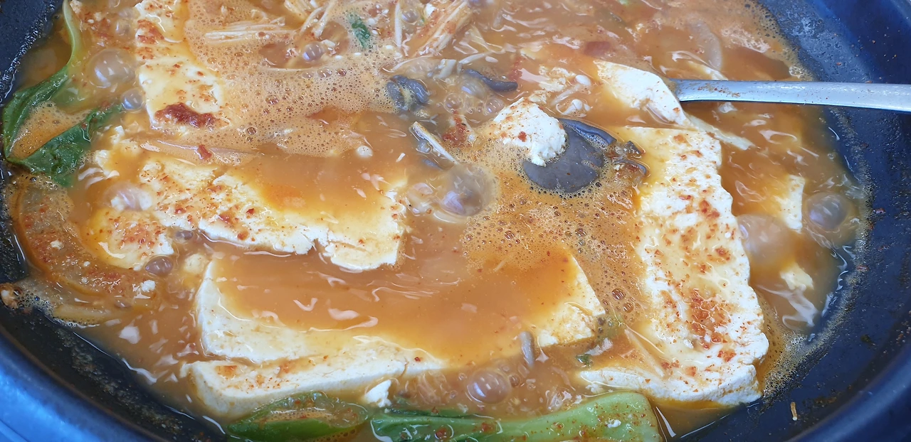뜨뜬한 두부찌개, 여자들이 좋아할 만한 반찬들이 상을 가득 채운다.