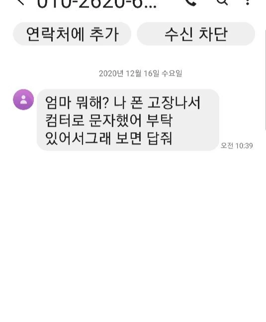 " 엄마, 뭐해? 나 지금 핸드폰이 고장나서...부탁있는데 전화 좀 줘"란 수상한 문자를 받았다.