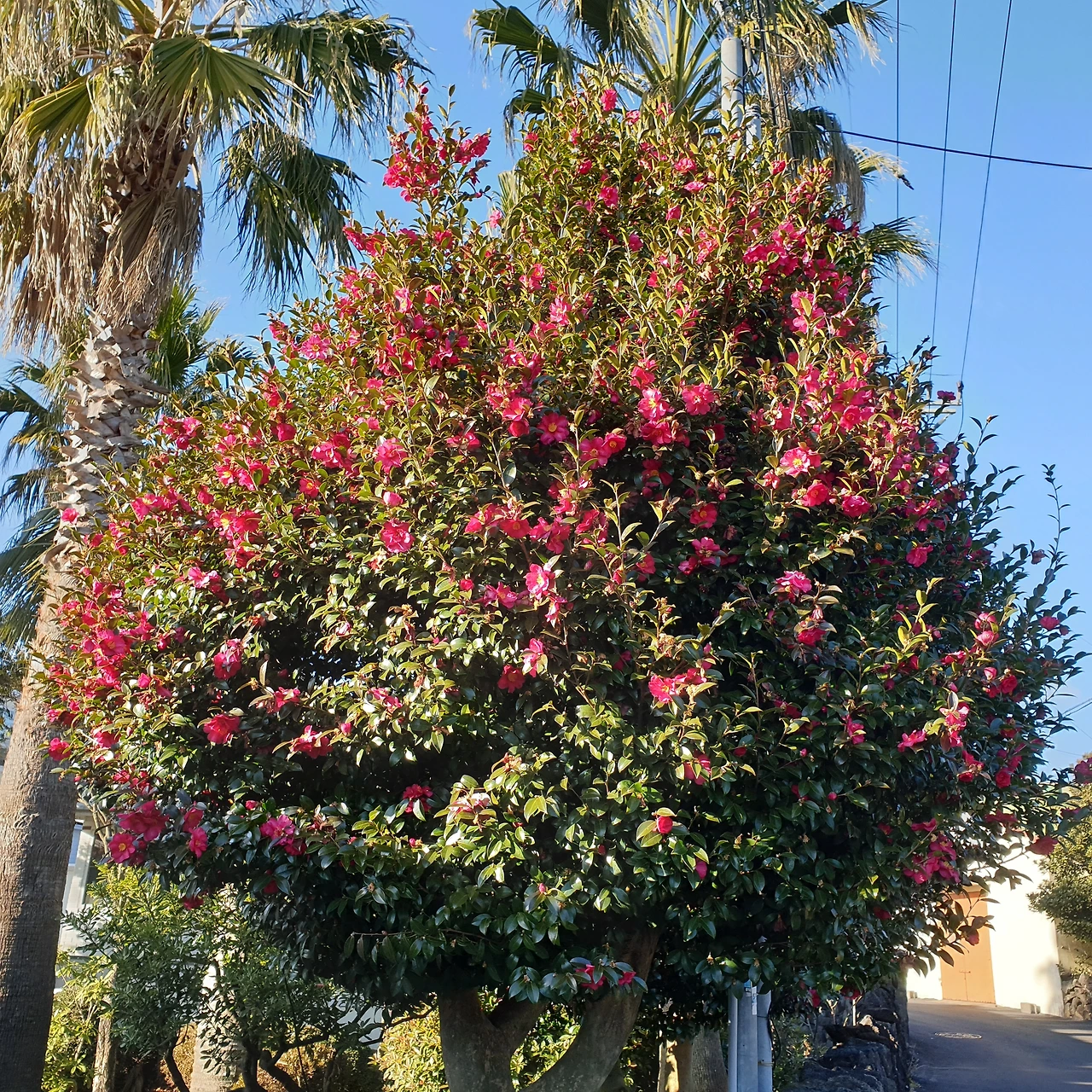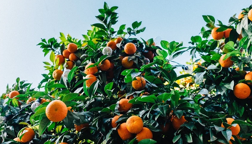 낮은 돌담사이로 주황색의 귤나무에 귤이 주렁주렁,
