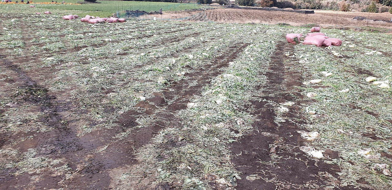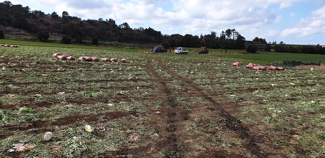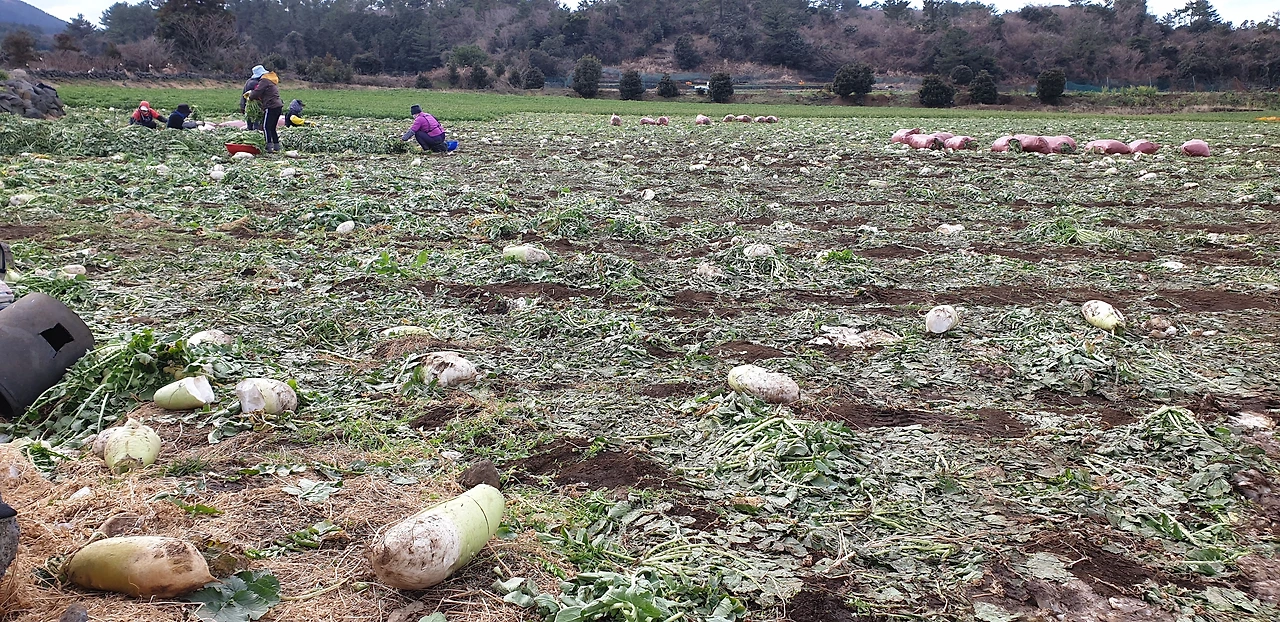 제주밭에서 무가 한창 정리중이다.