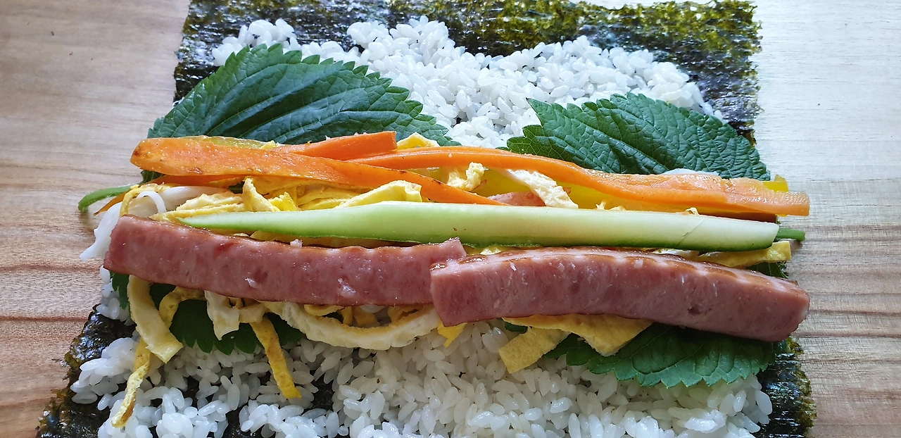 다른게 있다면 햄을 한 번 데치는 것? 당근을 얇게 써는 것? 밥에다 소금, 참기름,매실액을 조금 넣는것?