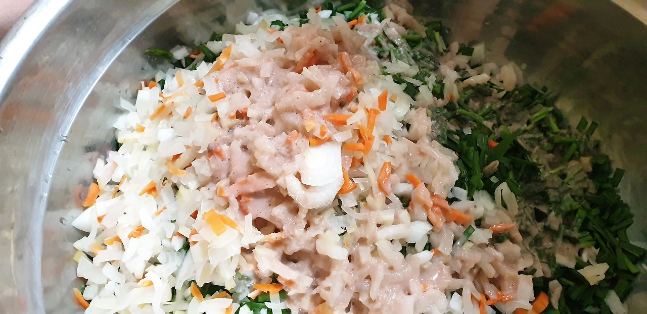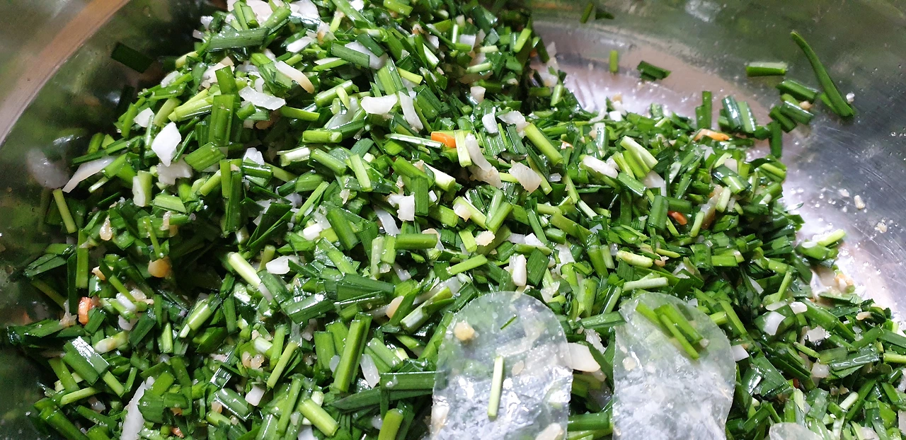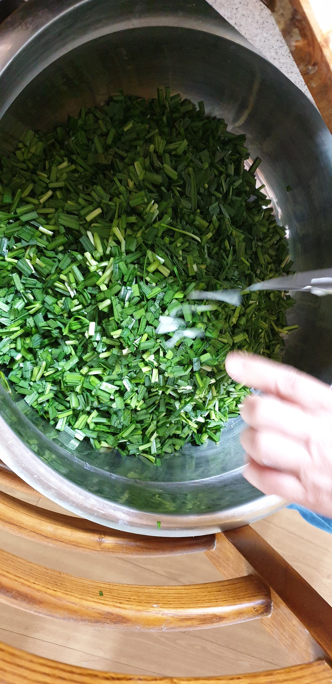부추 송송송, 작게 작게 썰고 무도 약간, 당근도 약간,