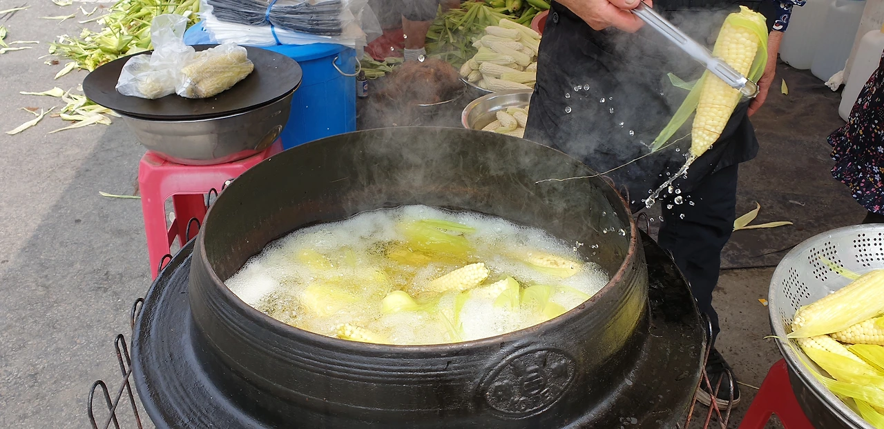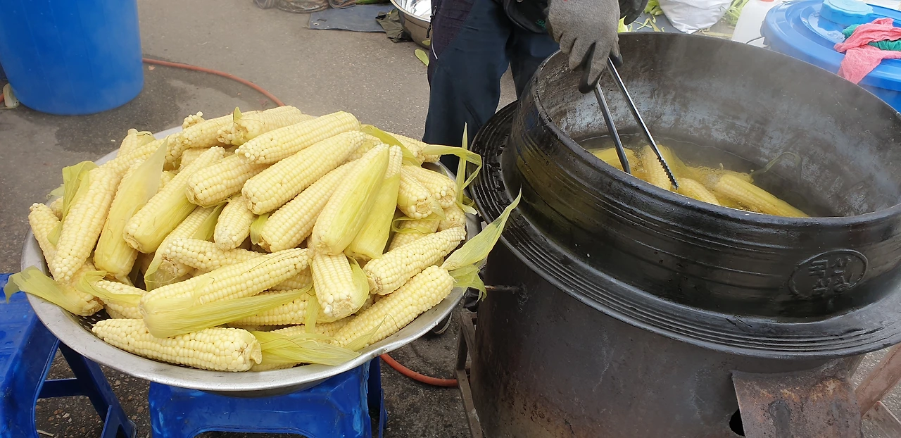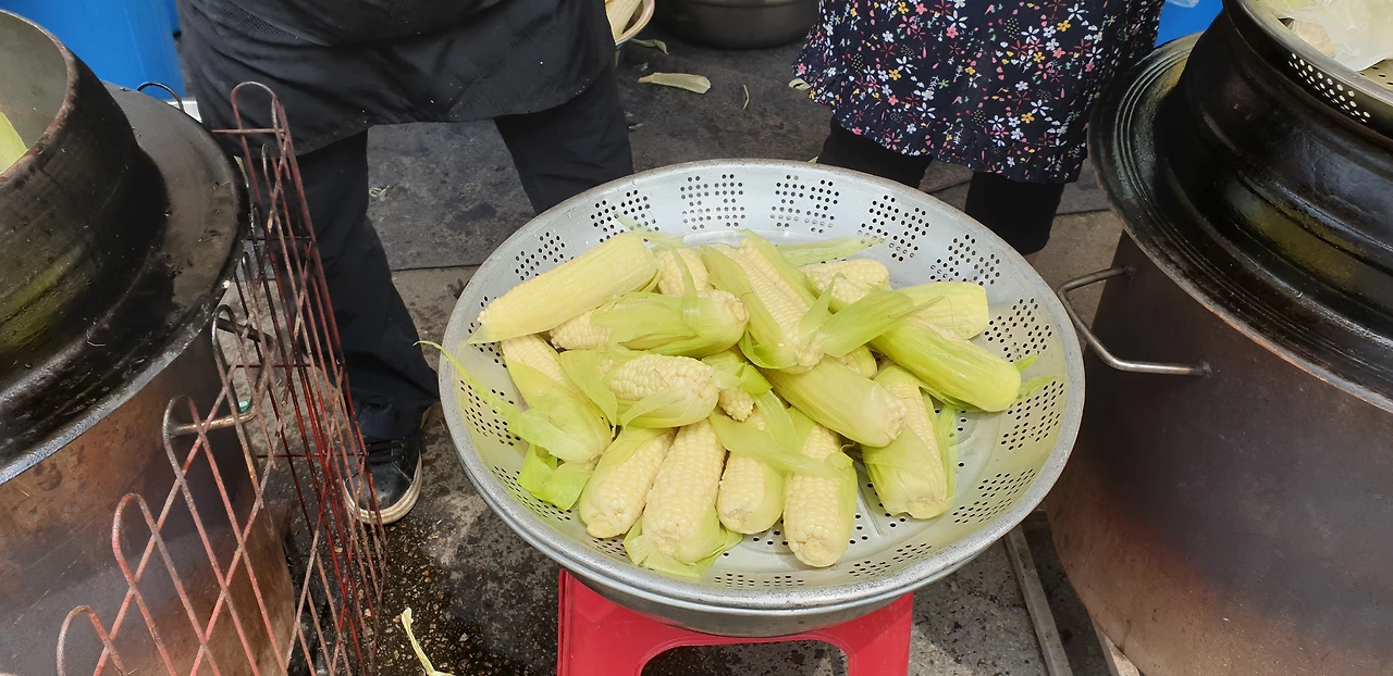농작물에도 학력이 붙는게 재밌다만 북평시장 오전 11시쯤에는 초당옥수수가 팔팔 끓은 솥에서