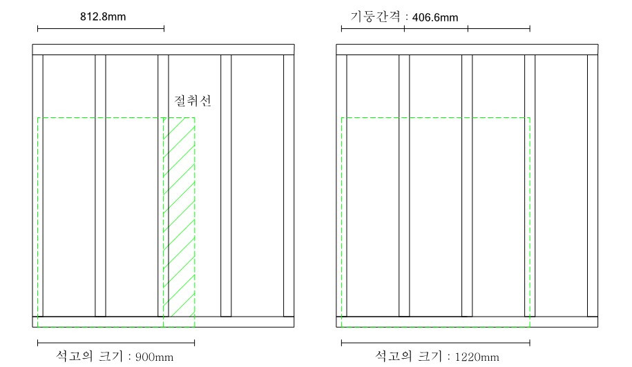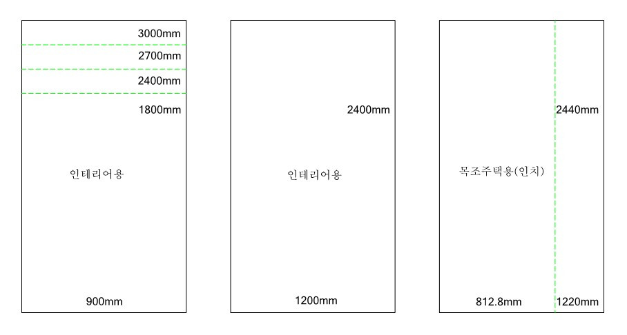 수치 단위가 달라 생기는 석고보드의 크기 (일반용과 목조주택용)