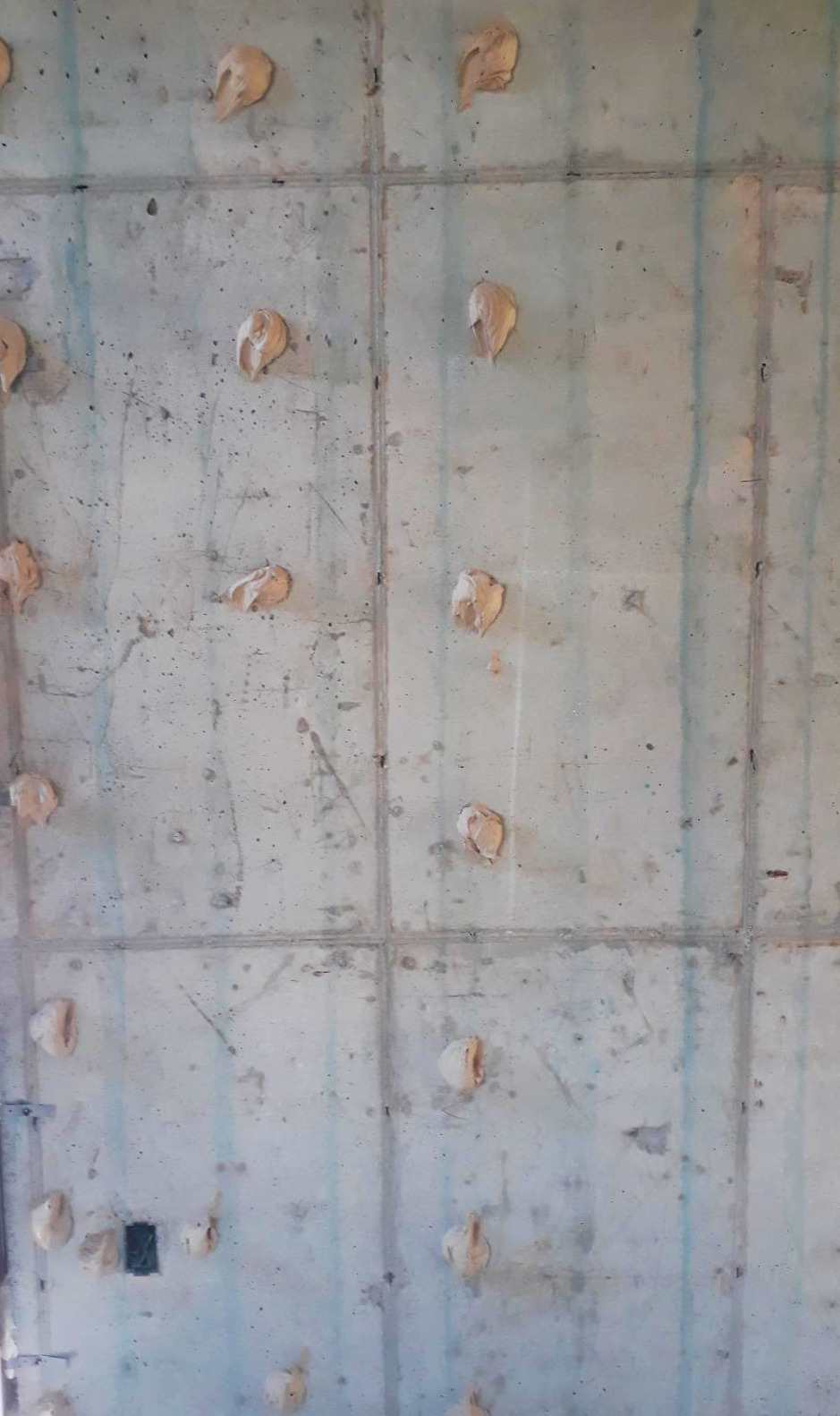 1) 콘크리트 벽체 / 2) 프라이머 도포 / 3) 프라이머 상단에 석고 본드 부착