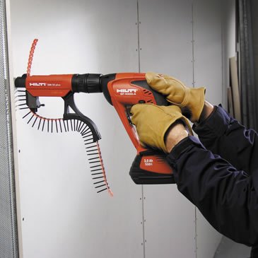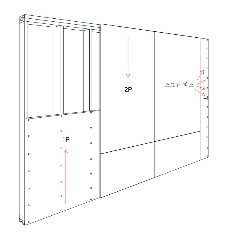 석고보드를 두장 겹쳐 부착할 때 1P는 피스로 결속하고 2P 석고보드 전용 타카핀으로 마감한다.