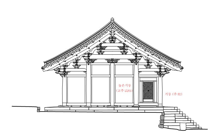 대들보는 기둥과 보에 의한 구조로 13세기 이후 건물의 큰 특징의 하나는 고주와 퇴보를 사용해서 넓은 개방된 실내 공간을 확보, 삼국시대에는 널리 사용되지 않았던 것으로 보인다. - 한국건축의 역사 (김동욱)
