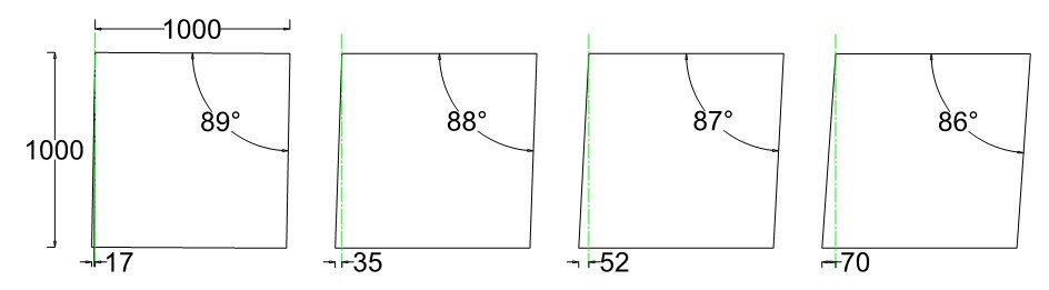 우리 일상에 드러나지는 않지만 바닥과 천장, 벽체 또한 반듯한 네모가 아닌 약간은 삐딱한 사각형을 이루고 있다. 아래 그림은 1m * 1m 거리의 천장이 1도씩 틀어졌을때 오차를 그려 보았다.