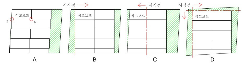 A 타입은천장의 평면을 따라 시공한 형태로 벽에 위치한 모서리(a) 부분에 공간들이 발생한다. 차후 벽에 부착되는 석고보드에 의해 그 틈들은 가려지지만 'b' 위치의 석고보드모서리는 시공 과정에서 깨지기 쉽고 후 공정에 어려움을 주기에 꺼리는 방법이다. B타입은 틀어진 벽면과 일정 간격을 띄워 시공해 나가는 방식으로 가장 많이 사용되는 방법이다. C타입은 b타입의 연장 선으로 석고보드 길이만큼 간격을 띄워 시공한다. D타입은 사면의 벽이 틀어졌을 때 시공하는 방식이다. A와 B, C, D 타입의 다른 차이는 하나의 기준점을 설정해 석고보드의 면을 정렬해 부착해 나간다. (기울어진 벽체에 석고보드 부착시 같은 방법을 적용)