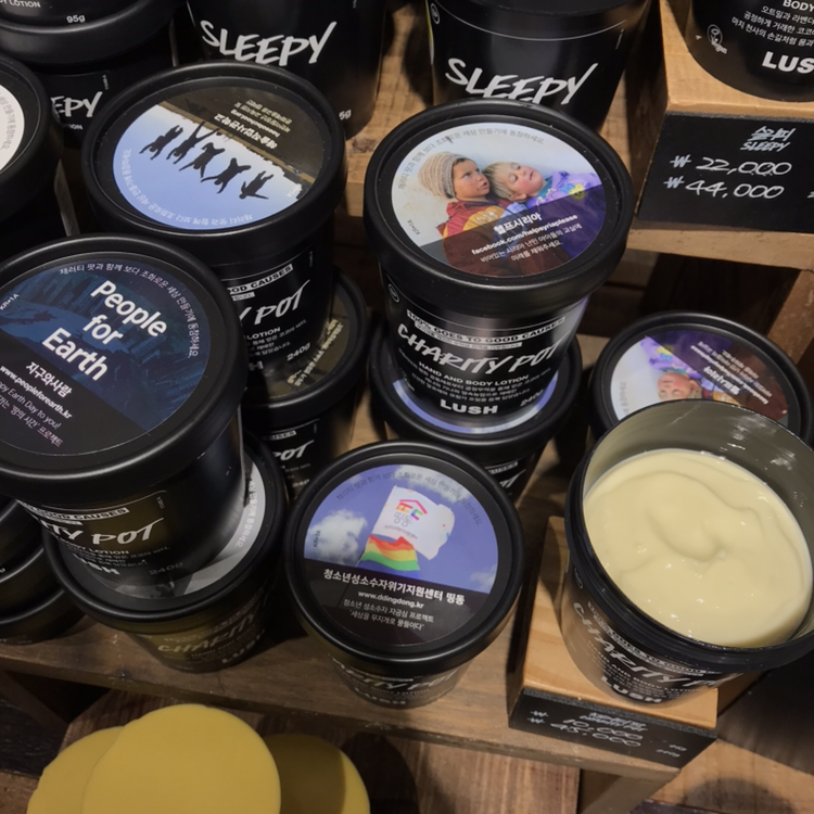 러쉬 매장에 가면 채러티 팟을 만날 수 있다. 혹시 그냥 지나쳤다면 한 번쯤 상품을 살펴보기를 권해본다. 채러티 팟에는 비영리단체의 이름이 새겨진 스티커가 붙어있다. 채러티 팟을 사면 부가세를 제외한 금액이 후원에 쓰인다.
