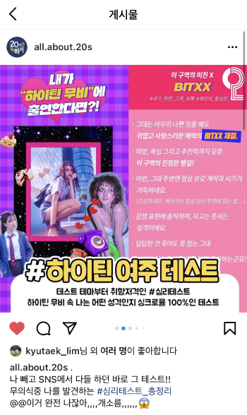 mbti 테스트 치고 디자인에 대한 언급도 꽤(?) 있었던 편이라고 생각한다 ㅎㅎ 사실 디자인의 영역에 있지만, 애초에 하이틴을 콘셉트로 잡은 것 자체가 마케팅의 한 요소라고 할 수 있는 것이다.
